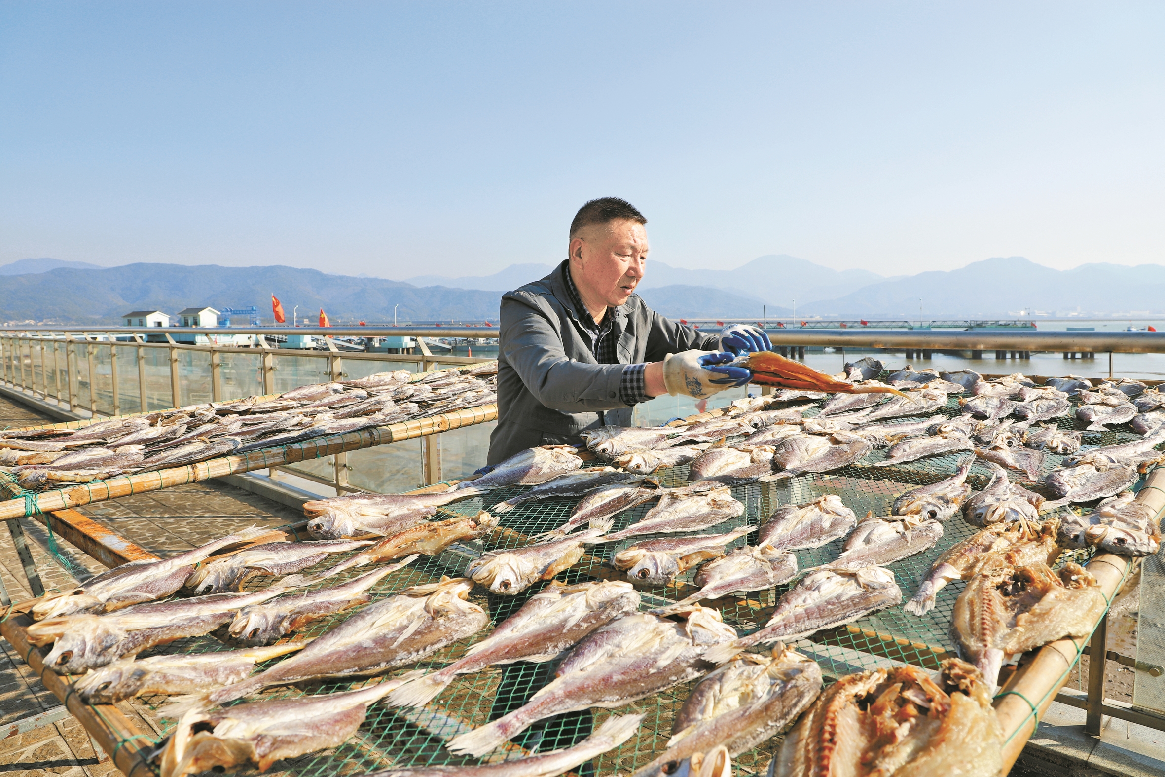 黄花鱼、鲳鱼、鳗鱼、米鱼、马面鱼……在峡山码头旁的晒场上,晾架上整齐铺展着各类海鱼。据了解,当地晒鱼鲞沿用传统工艺,仅以粗盐处理,最大限度锁住海鱼鲜味。