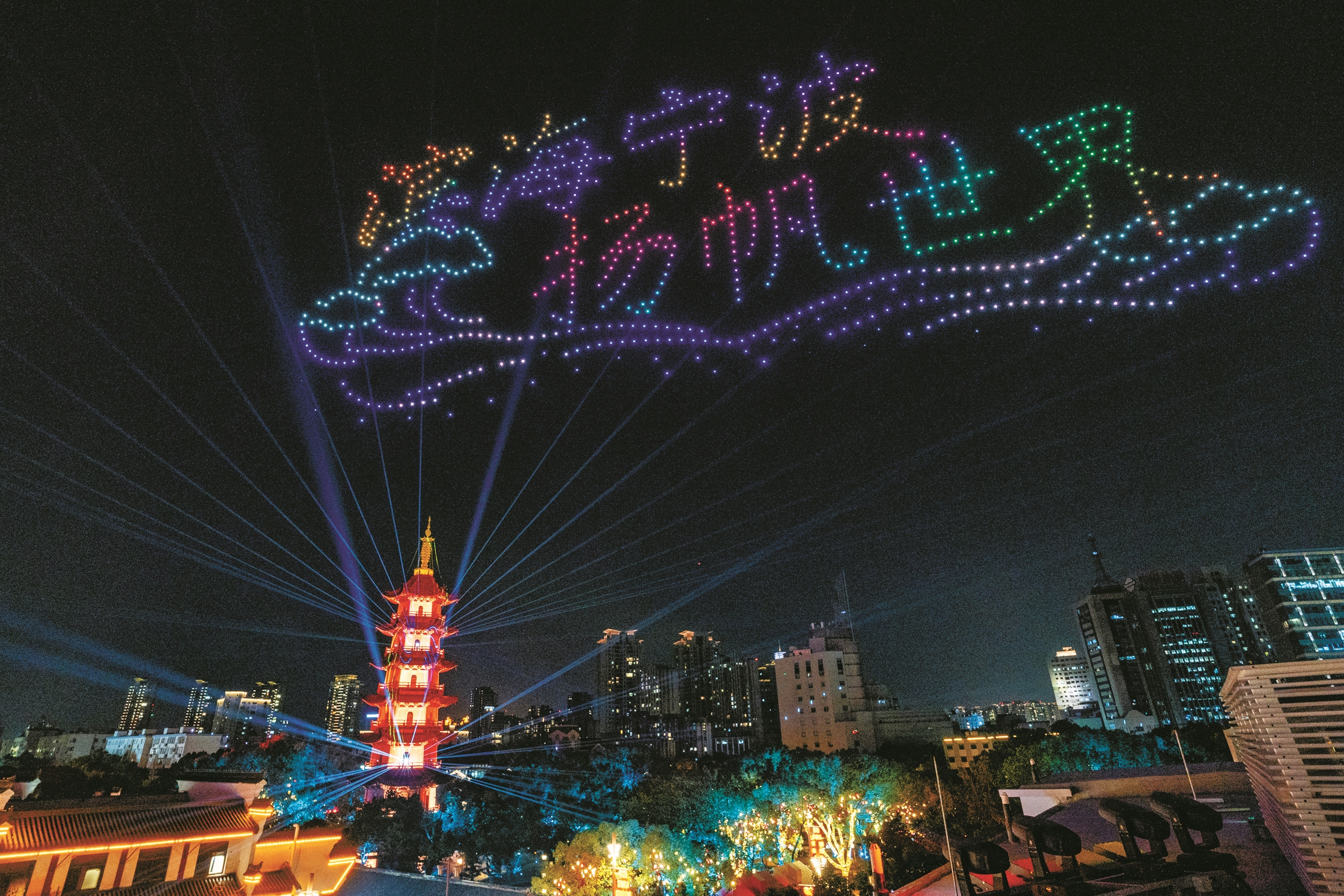 天封塔点亮仪式是本次活动的主要亮点之一。这座沉寂多年的宁波地标,在完成70余天保护性改造后,通过外围投光与激光勾勒等技术,首次披上“光影新衣”。今后,天封塔将以平日和假日两种模式常态化亮灯,成为市民夜游和体验城市文化的新节点。