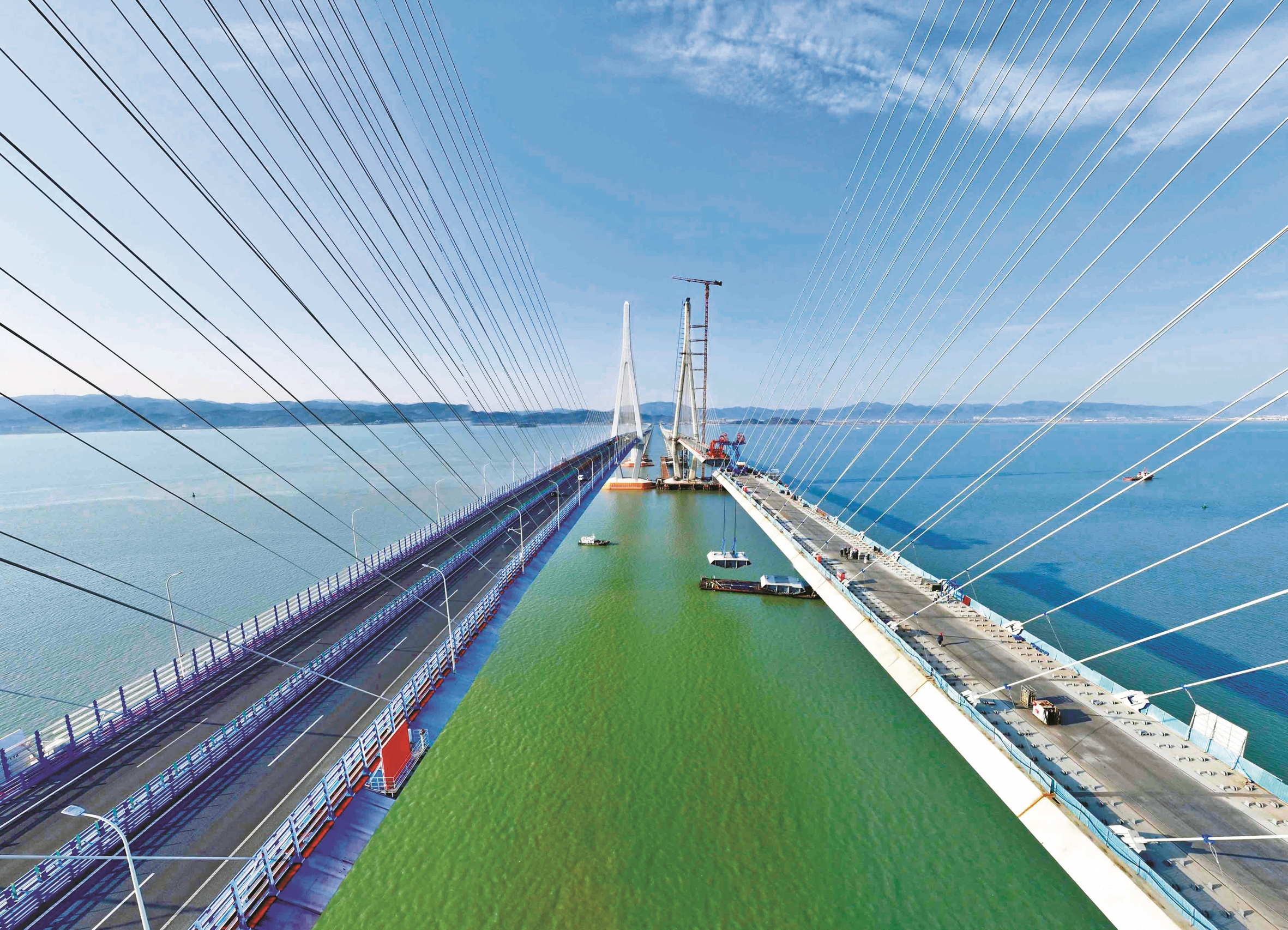昨日,市域铁路象山港跨海大桥建设现场一派繁忙景象,运梁船精准就位,建设者们手持对讲机反复协调确认,两座钻石造型的双子星塔之间,主桥倒数第4片钢箱梁缓缓升空,向着最后36米合龙目标全力冲刺。这片钢箱梁的成功吊装,标志着历经近8个月的主桥钢箱梁架设工程进入收尾阶段,市域铁路象山港跨海大桥进入合龙倒计时。