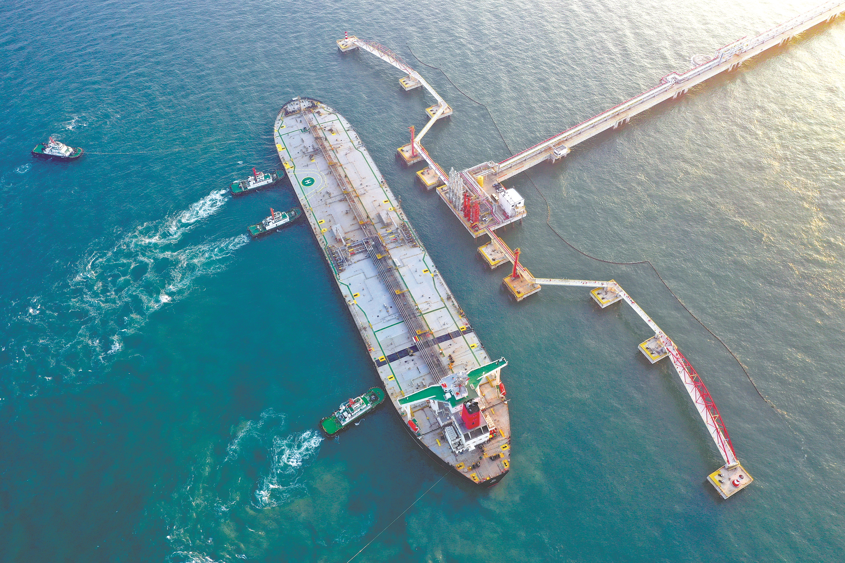 12月18日,一艘装载着17.9万吨石化原辅料的船舶泊入国投洋浦油储码头30万吨级原油泊位(无人机照片)。这是海南自由贸易港正式启动全岛封关后洋浦港口岸第一批通关的“零关税”石化原辅料,进口量为17.9万吨,货值近4亿元,较封关前在进口环节为企业节省成本近千万元。(新华社记者 郭程 摄)