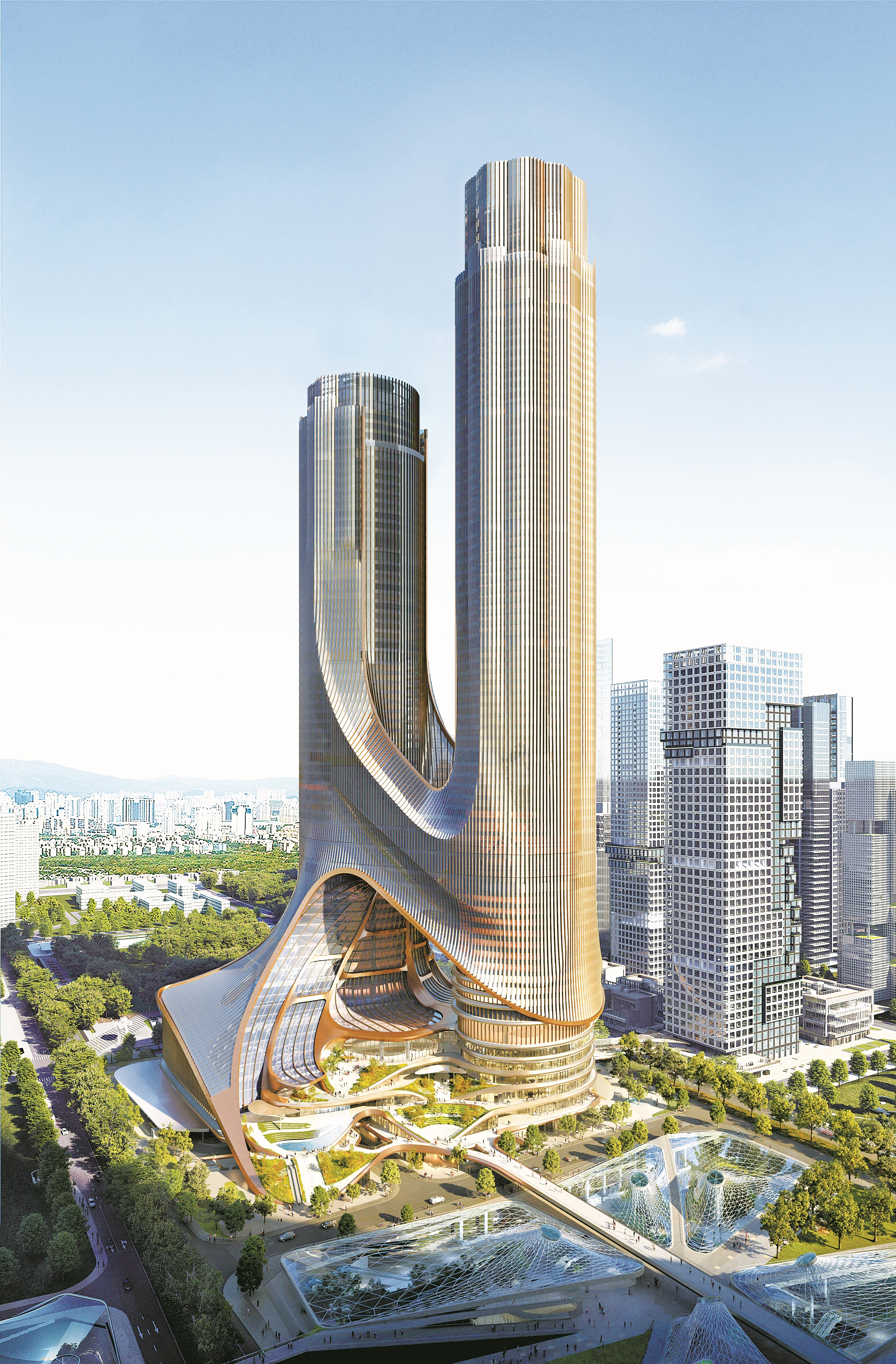 C塔项目位于深圳湾超级总部基地“十字双轴”空间格局的中心区位,总建筑面积54.8万平方米,由东塔与西塔两座塔楼组成,将被打造成为集办公、酒店、商业、文化、交通于一体的多业态综合体。