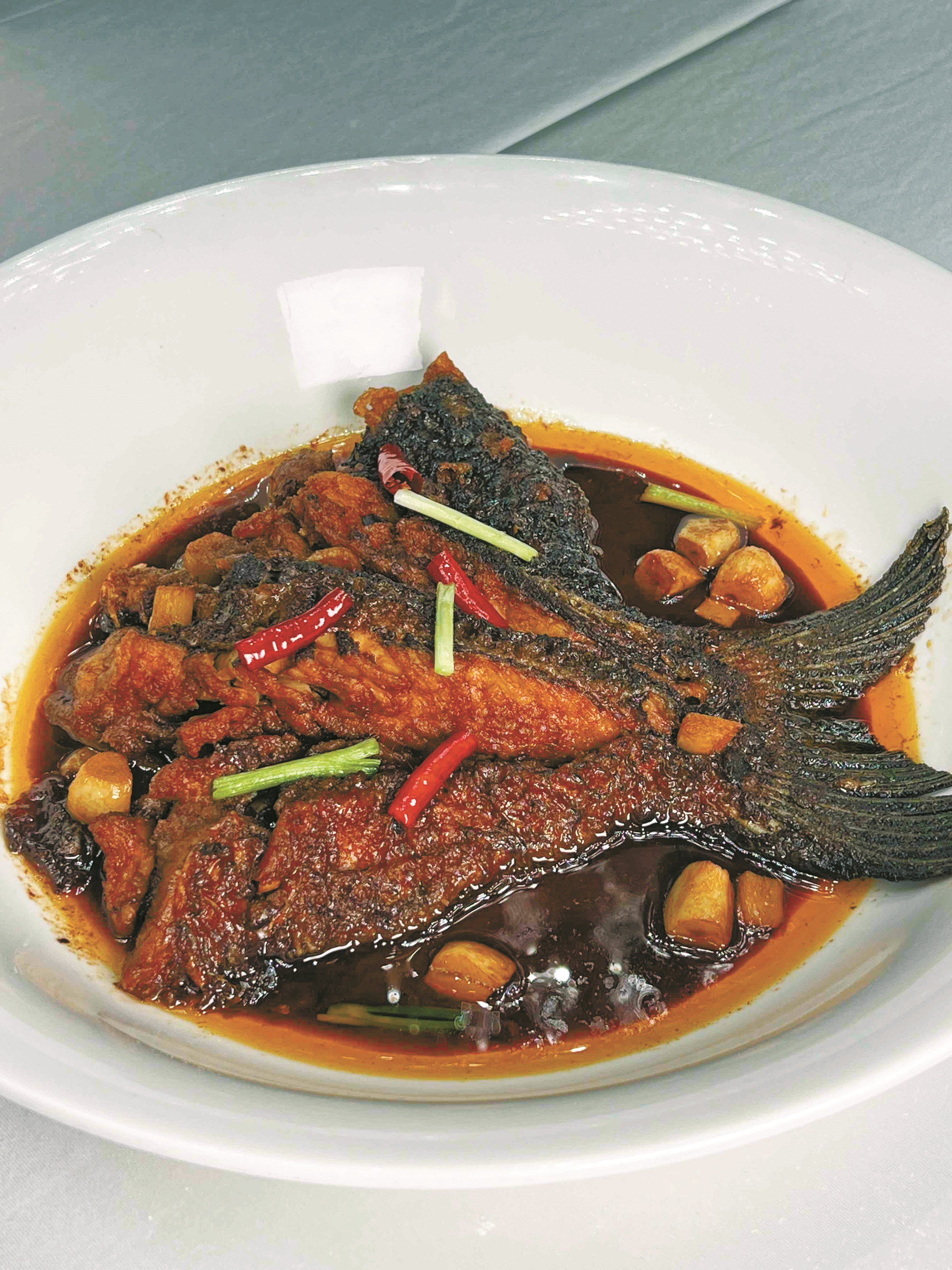 “这道菜用的是青鱼最富胶质的尾段,青鱼尾部因常年划水,肉质格外细嫩。”东钱湖华茂希尔顿酒店主厨王平杰对这道菜颇有研究,“烹饪时以浓油赤酱焖烧,酱汁层层渗透,出锅时色泽红亮,鱼肉嫩滑弹牙,胶质在舌尖化开,满口醇厚鲜香”。