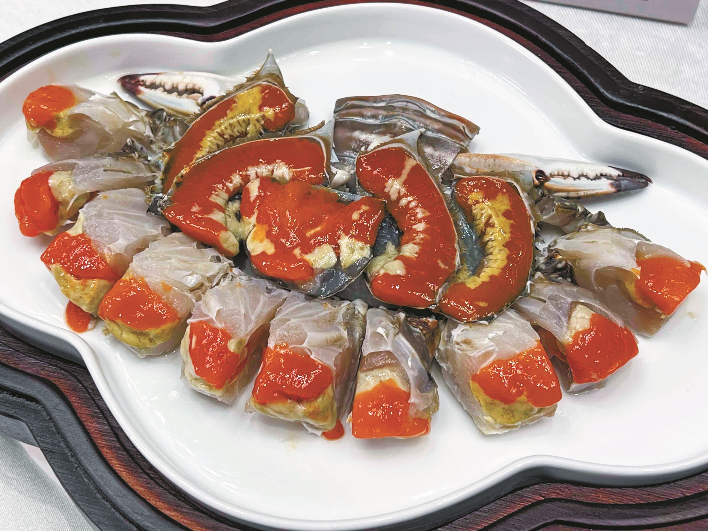 初冬时节,梭子蟹膏红肉满,经盐水呛制后,蟹肉细嫩鲜甜,红膏似凝脂,入口即化。