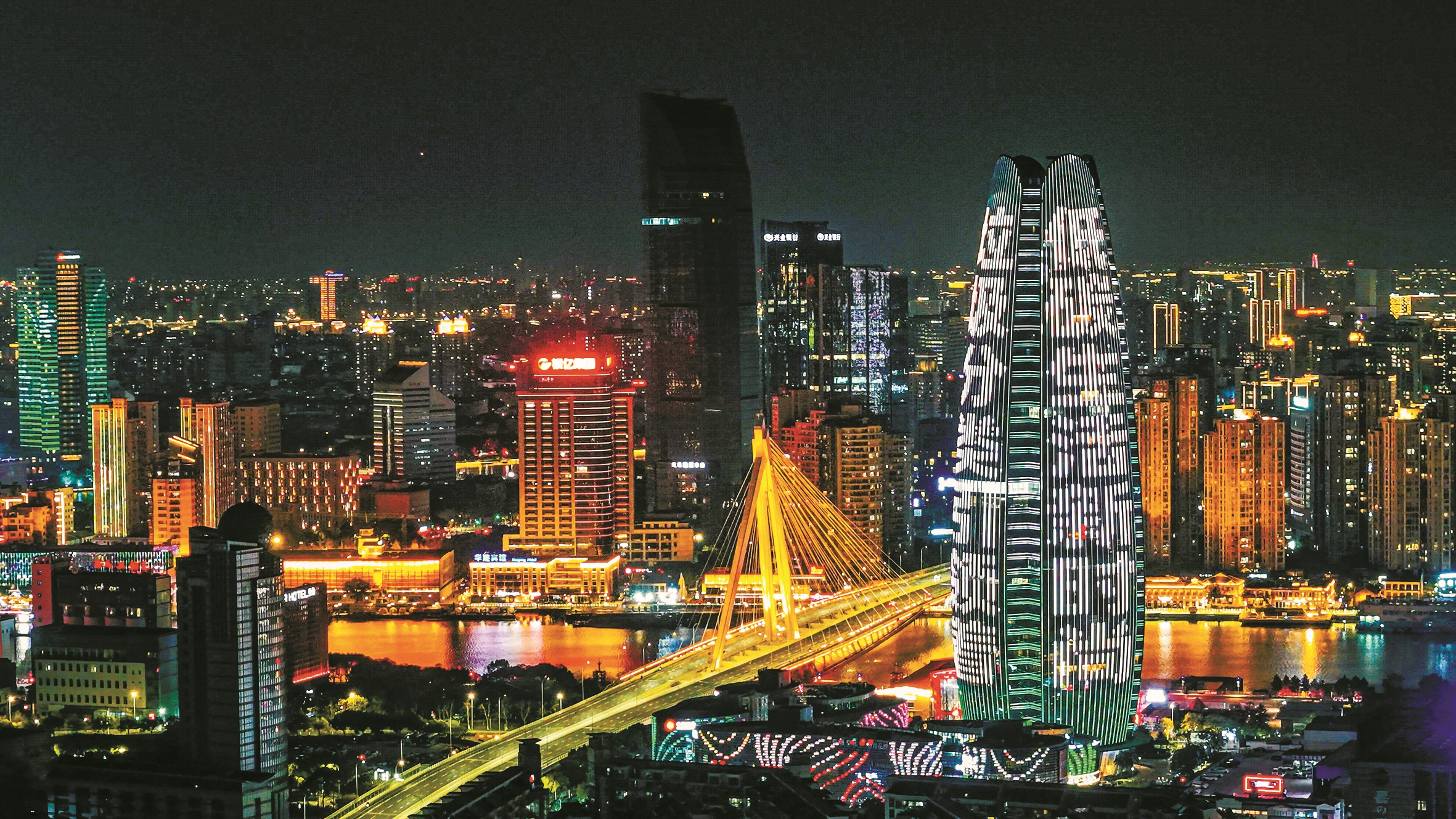 三江六岸沿线上演垃圾分类主题灯光秀。(王嘉彬 朱亭汀 摄)