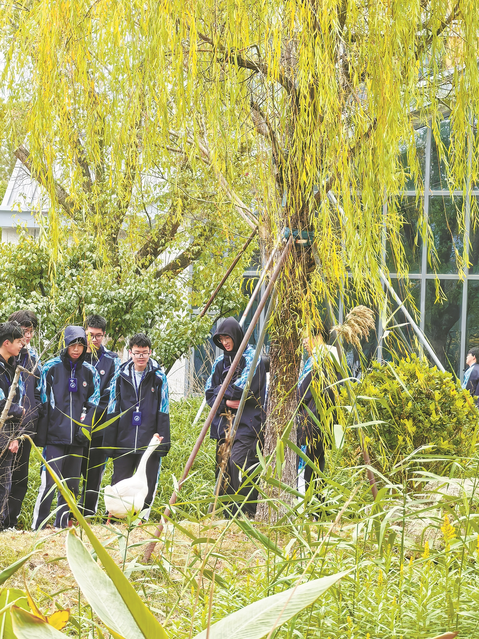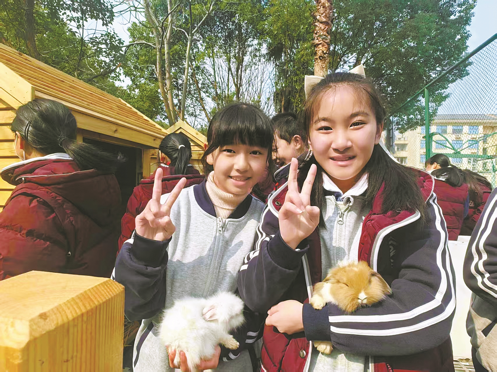 为了照顾好这些“新朋友”,学校面向初中学段招募志愿者,最终组建了50人的“动物守护团”。804班的戴同学是羊驼专属护理员,放学时,他拿着扫帚打扫羊驼的“小屋”,给它添食换水。“学习累的时候来这儿待一会,很减压。”他说自己从小就喜欢小动物,现在能在学校实现“撸宠自由”,别提多开心了。