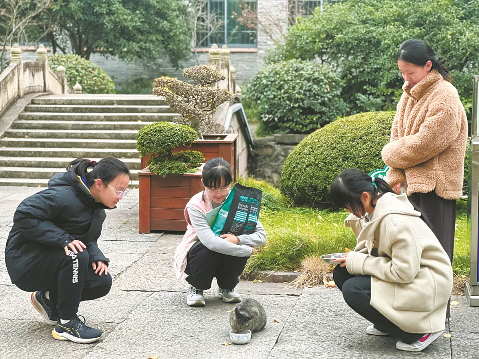 除了入驻的萌宠,学校对“原生居民”也格外温柔。在镇海中学,一群流浪猫被师生们细心呵护着,这一切源于一个叫“燃灯护猫社”的社团。“‘燃灯’就是要给这些小生命点起一盏暖灯。”社长周婉若说,这个由50余名学生组成的社团,已经坚持了多年。