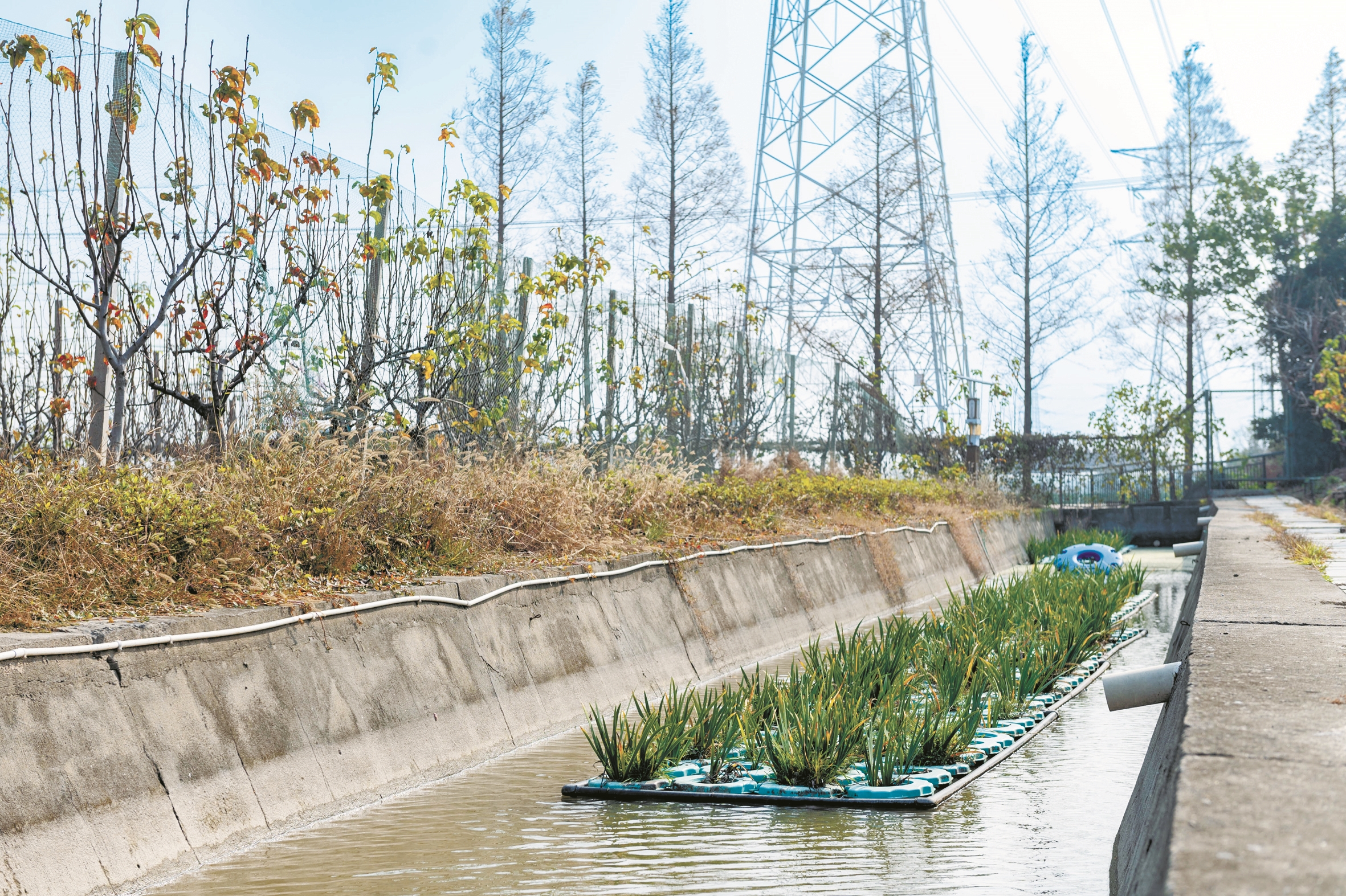 田边河道内,净水植物葱茏,生态透水坝、生态拦截带、生态浮床等组成天然滤网,既减缓氮素流失,又增强生物固碳能力……