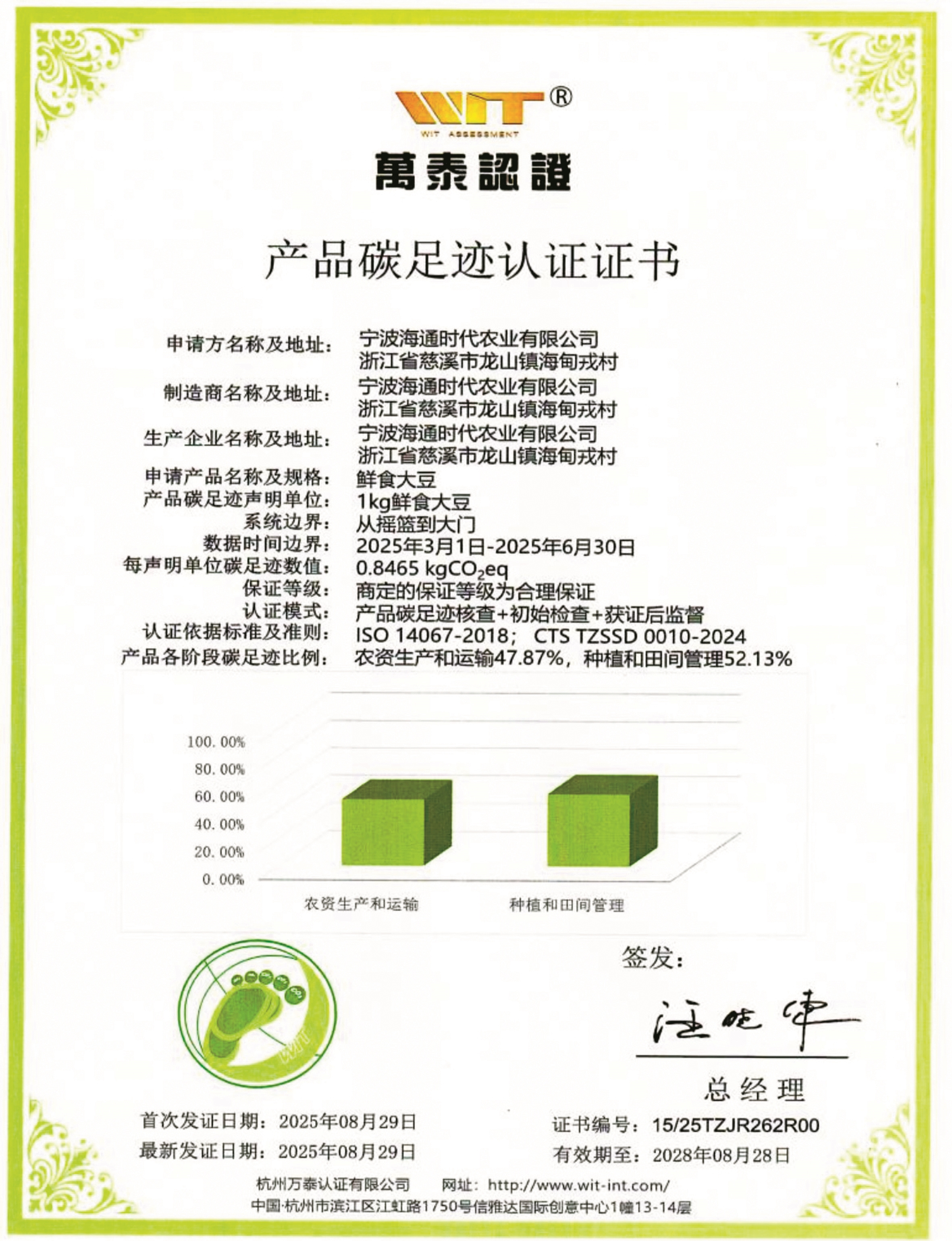 这是9月下旬海通时代获得的国内首张鲜食大豆产品碳足迹认证证书。证书上的“0.8465千克二氧化碳当量”,就是他们农场鲜食大豆的碳足迹数值。
