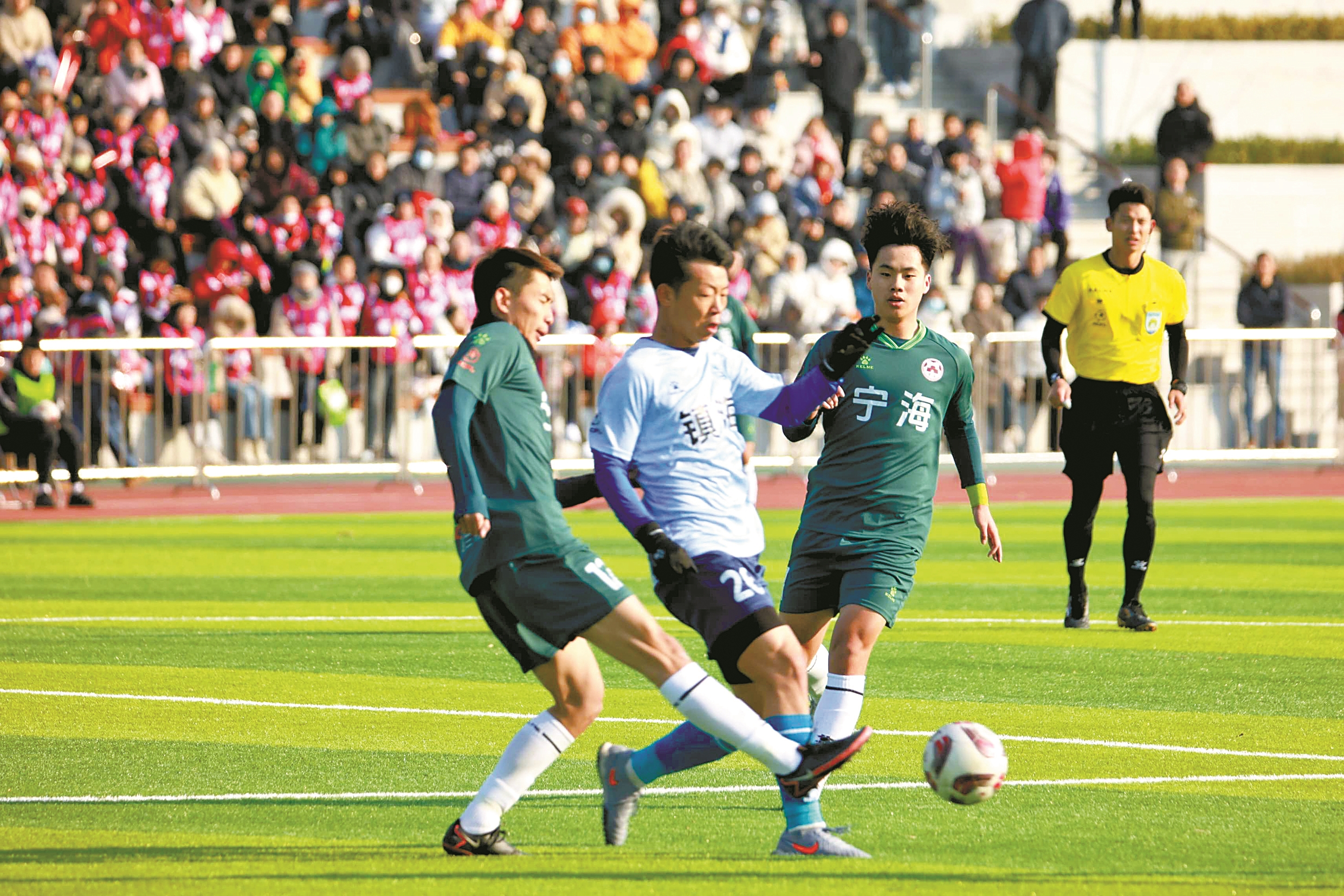 转折发生在第78分钟,宁海队替补出场的11号林子墨在禁区里拿球摆脱时,被对方防守队员绊倒在地,裁判判罚点球。随后,21号李天亮一蹴而就,宁海队再次取得领先。