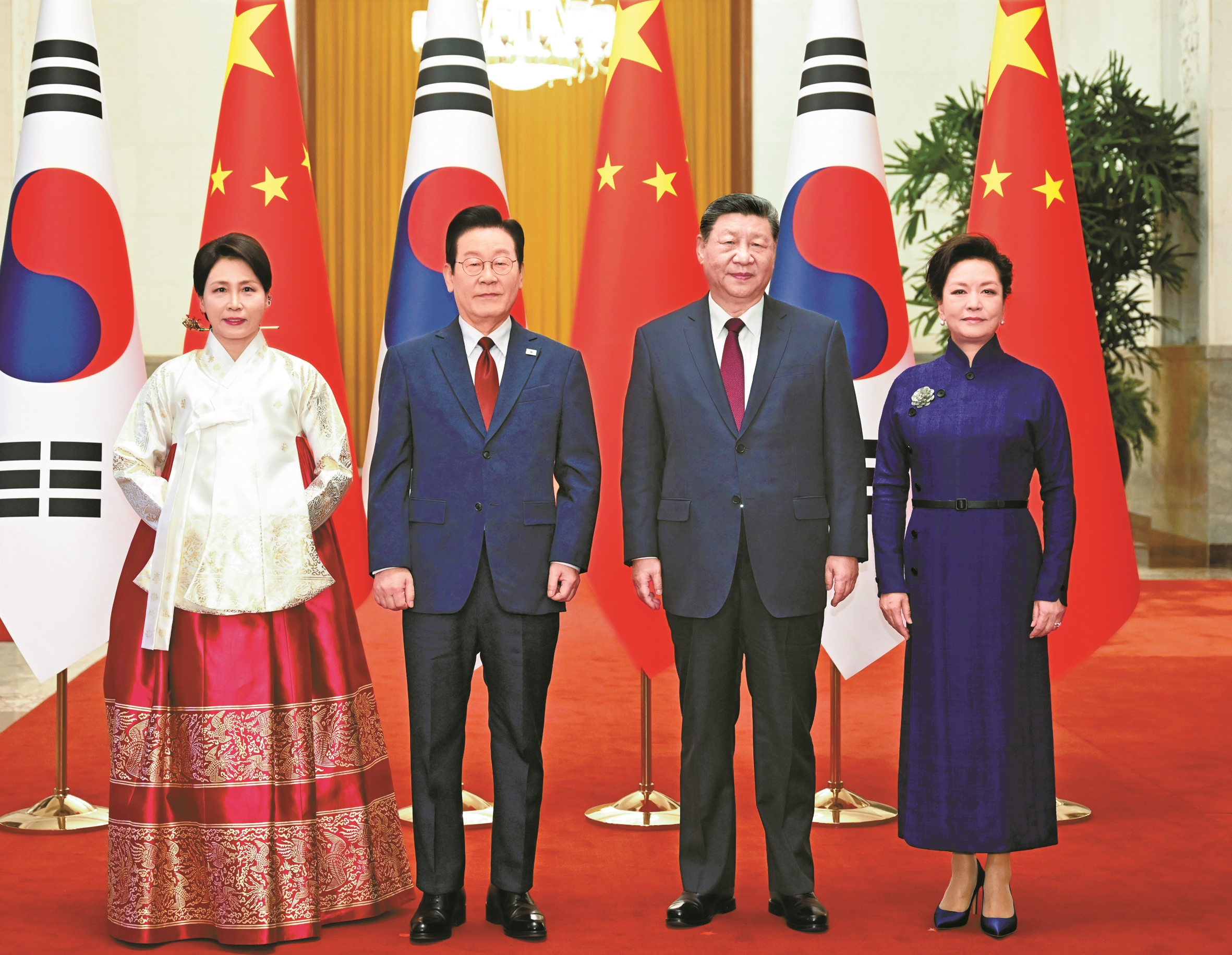 会谈前,习近平和夫人彭丽媛在人民大会堂北大厅为李在明和夫人金惠景举行欢迎仪式。