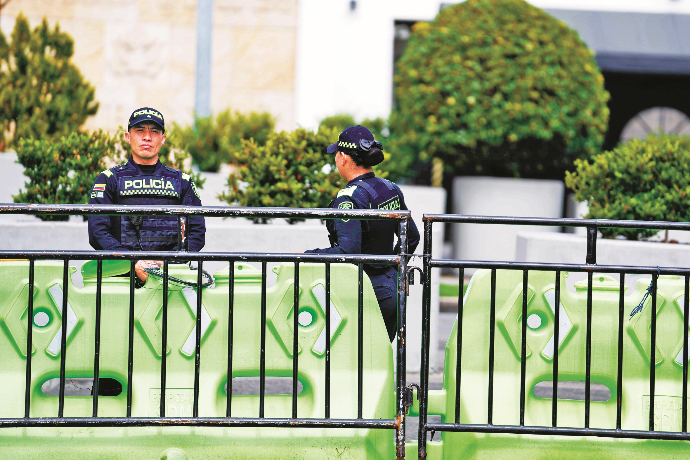 哥方目前已加强对美国和委内瑞拉驻哥伦比亚大使馆的安保工作。图为在哥伦比亚首都波哥大,警察在美国驻哥伦比亚大使馆外执勤。 新华社发(安德烈斯·莫雷诺 摄)