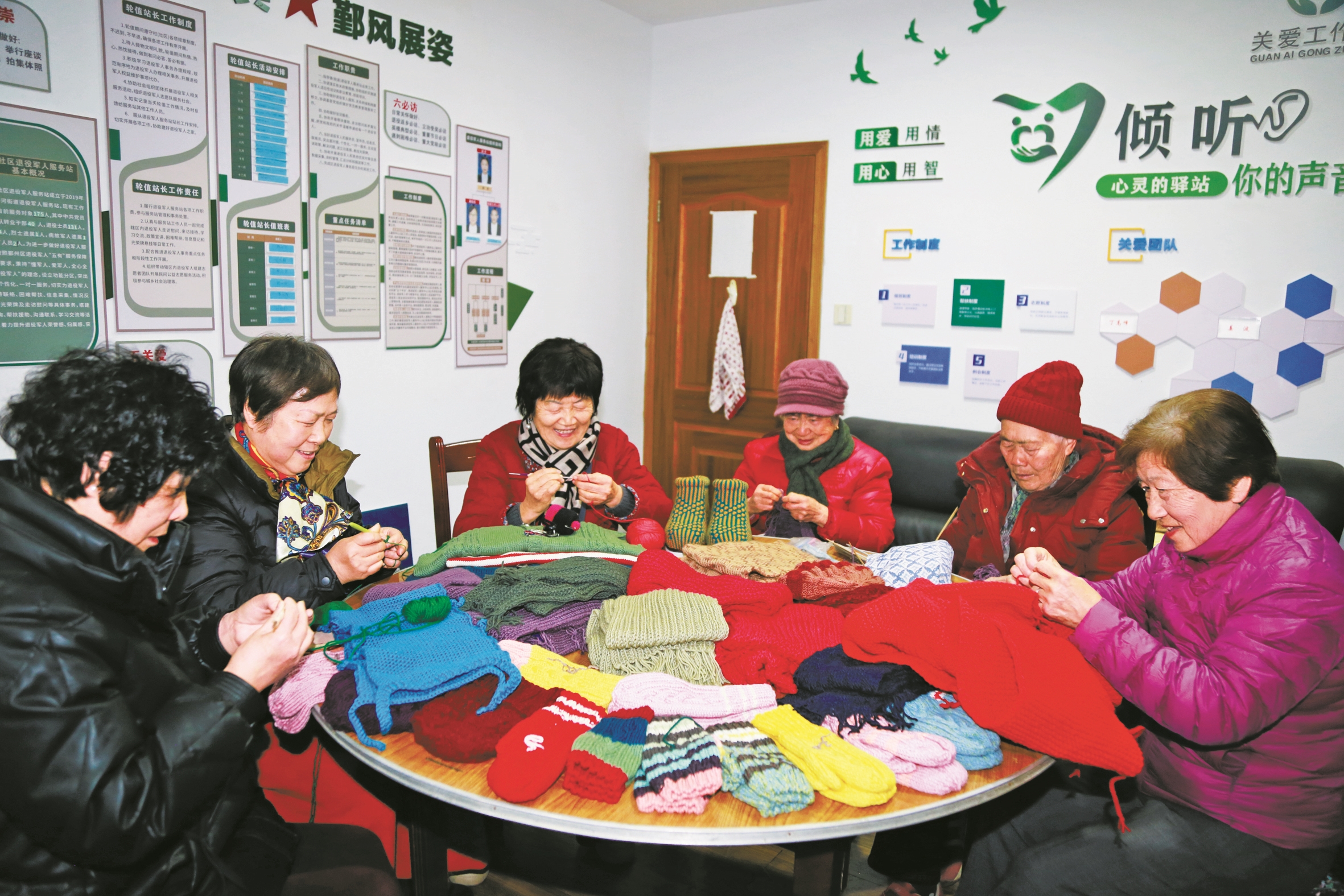 在鄞州区桑菊社区,百岁老人戴庆友近日再次收到一份手工编织的礼物——由围巾、手套、帽子、棉鞋组成的暖冬套装。和他一样,近期社区有50多位老人收到了这份心意。这些爱心礼物来自桑菊社区“七彩编织队”。编织队成立于2016年,从最初几人发展到如今20多人,累计手工织出上千件保暖制品,送给社区内的高龄、独居、失能失智等老人。(王博 陈娇娇 曾家宇 摄)
