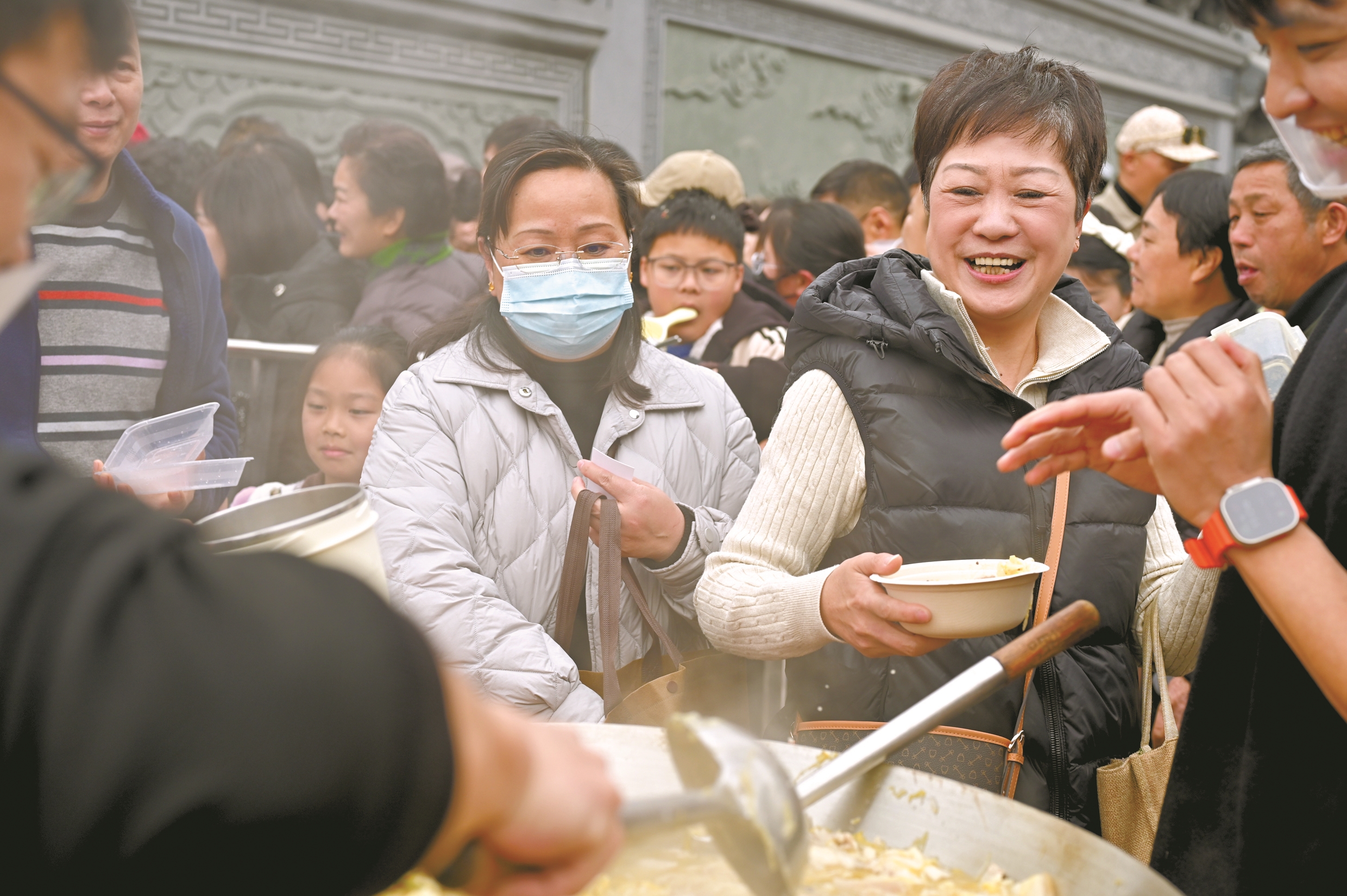“老底子味道”汁水年糕汤、酸菜猪肉炖血肠、猪杂汤等美食热气腾腾。现场,数千人自备碗筷,从各地赶来。