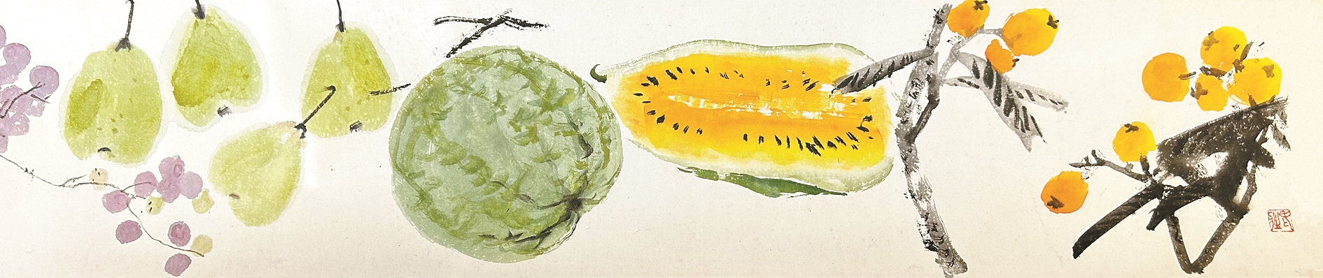 童衍方说,此卷画所用纸张原本是近百年前裱画店的旧存裱成联,纸是半熟宣纸,质地细腻。童衍方舍不得写对联,他携纸叩开张大壮先生画室。“纸太好了!”张大壮落笔即叹。据童衍方回忆,那日画室寂寂,只见大壮先生调墨运彩,从枇杷的金黄画到西瓜的浅黄,从梨子的水润画到葡萄叶的枯涩,墨彩交融,几无停笔。画梨时,水墨从笔肚自然渗化,梨肉饱满如含晨露;画葡萄则以干笔擦扫,枯润相生,似带秋霜。“你看那梨柄一笔,如铁画银钩——没有书法功底,画不出这等筋骨。”童衍方指向画幅,目光悠远,仿佛穿过五十二年光阴,又见那个伏案挥毫的身影。