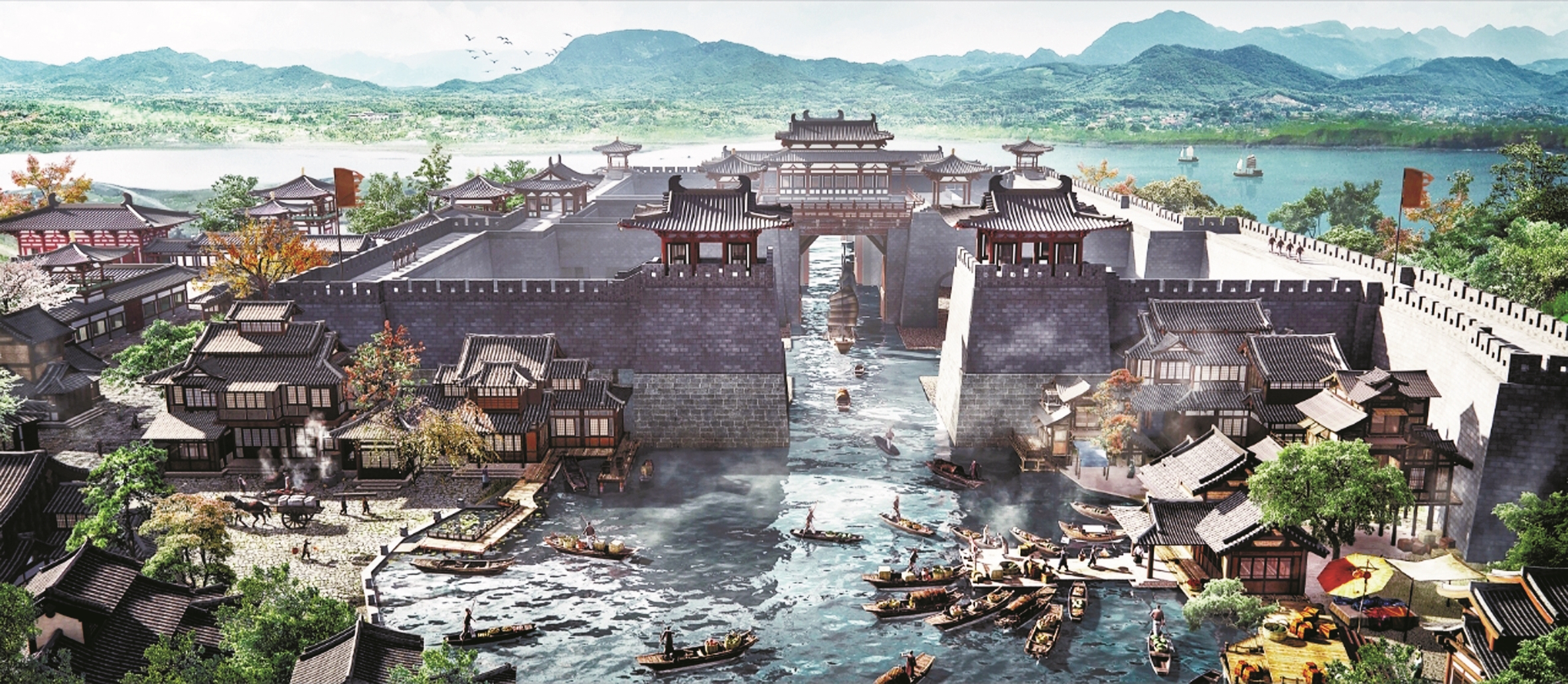 根据规划,水城门是整个项目的核心景观,城墙设计总长170米、高13米、底宽12米,建成后将是一座气势恢宏的仿古水关。运河从项目南侧的唐城引出,穿过水城门,串联起项目内的码头集市、盐商府宅、公主府、中心广场等多个场景,勾勒出古代江南水乡的独特景观。