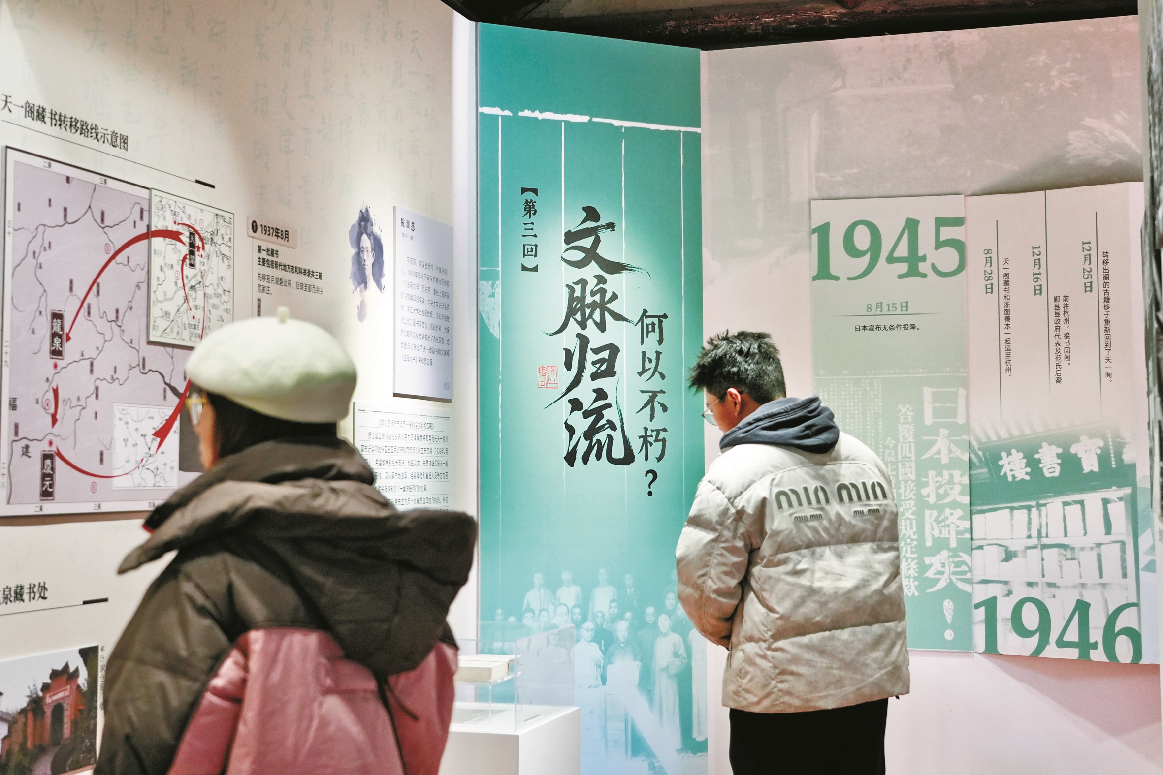 本次展览聚焦1933年至1949年这段特殊时期,通过三大篇章串联起天一阁重修、藏书转移、战后归阁等重要历史事件,借助一批珍贵照片、原始档案、地方史志等资料,讲述了在战火与动荡的年代里,先辈们如何跨越天灾、战乱,共同捍卫文明血脉的动人故事。