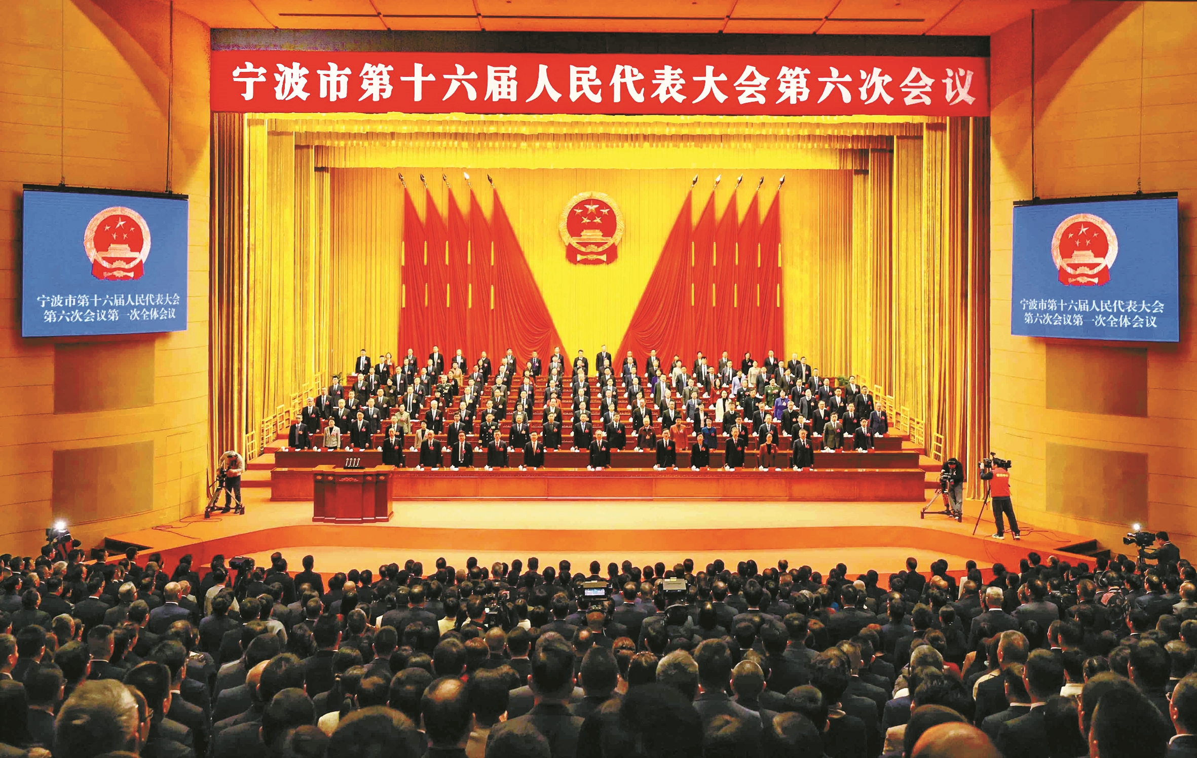 上午9时,大会主持人张平宣布:宁波市第十六届人民代表大会第六次会议开幕。全体起立,奏唱国歌。