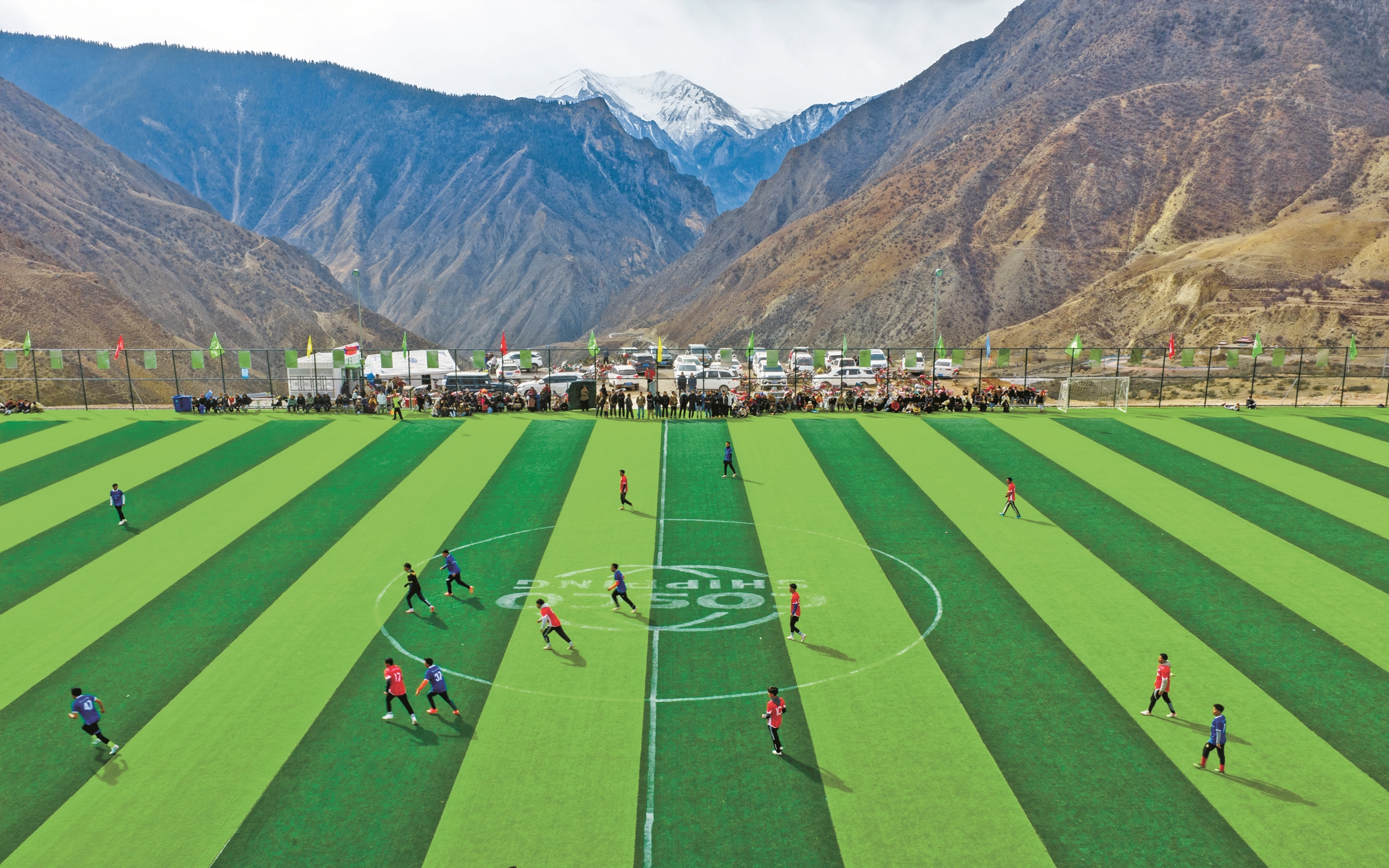 球员在西藏昌都市洛隆县马利镇“迎新杯”足球赛中(无人机照片,1月26日摄)。