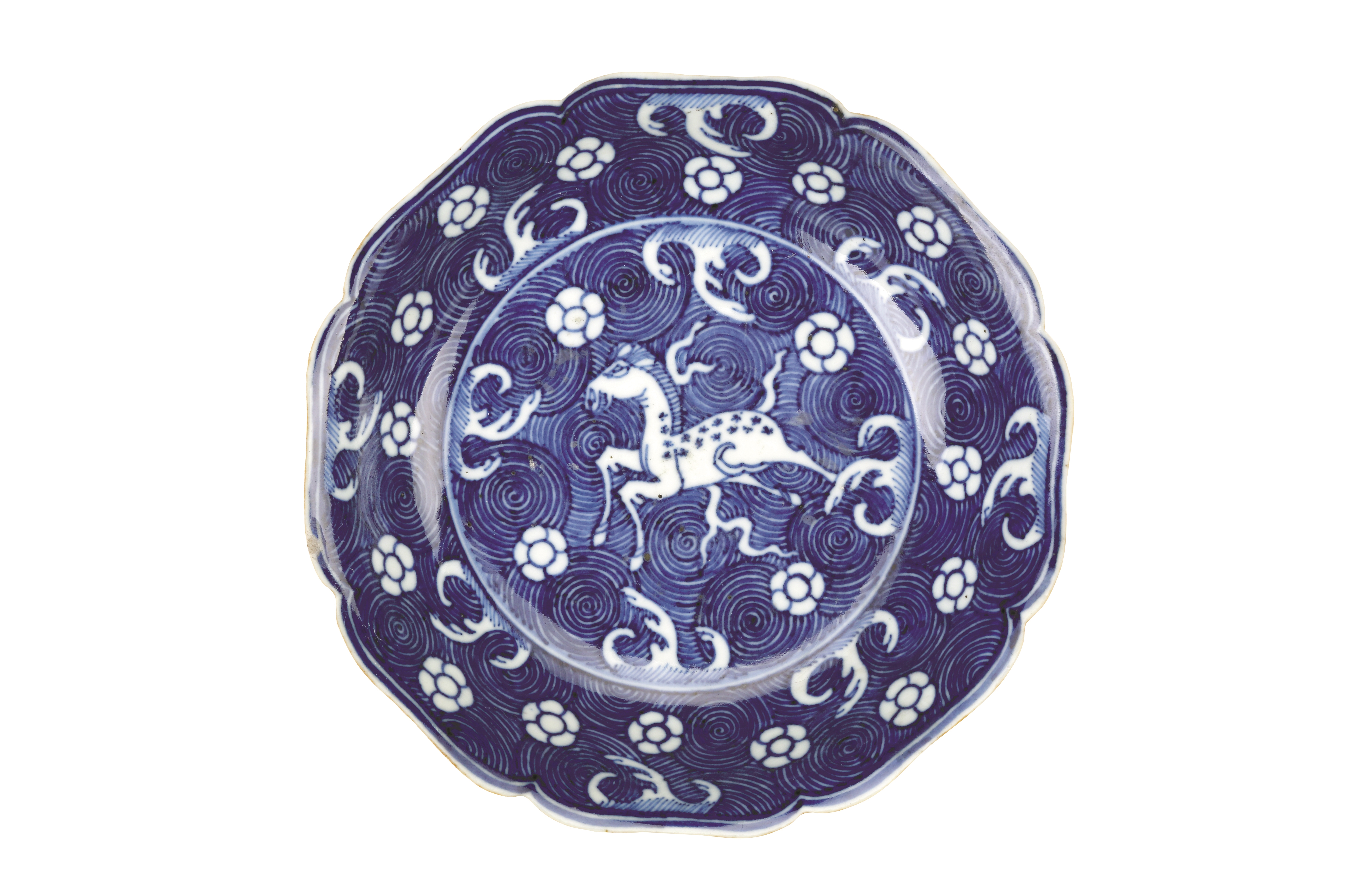 清康熙仿宣德蓝底白花海马纹葵口瓷碗