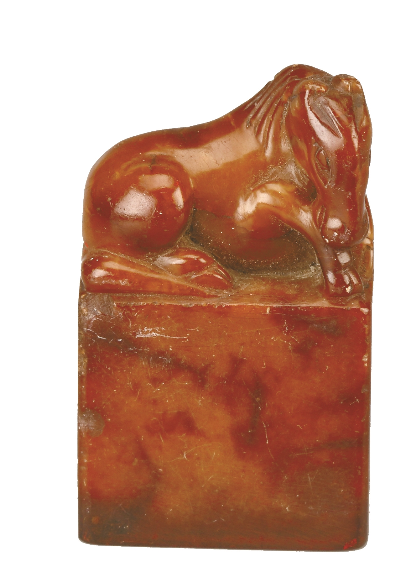自元明以来,寿山石成为文人喜爱的印材。此印即为寿山石制成,质地温润,色泽柔和。印通高5.4厘米,印面长3.3厘米,宽1.6厘米。印钮雕成一卧马,作垂首状,凸眼,闭口,鬃毛分披两侧,前侧双足前屈踏地,后侧双足则屈于身下,长尾摆向右侧,神情温顺,体态饱满,线条流畅,刻画生动。印文为阴文篆书“金石癖”,结体稍扁,线条流畅,风格工整端庄。