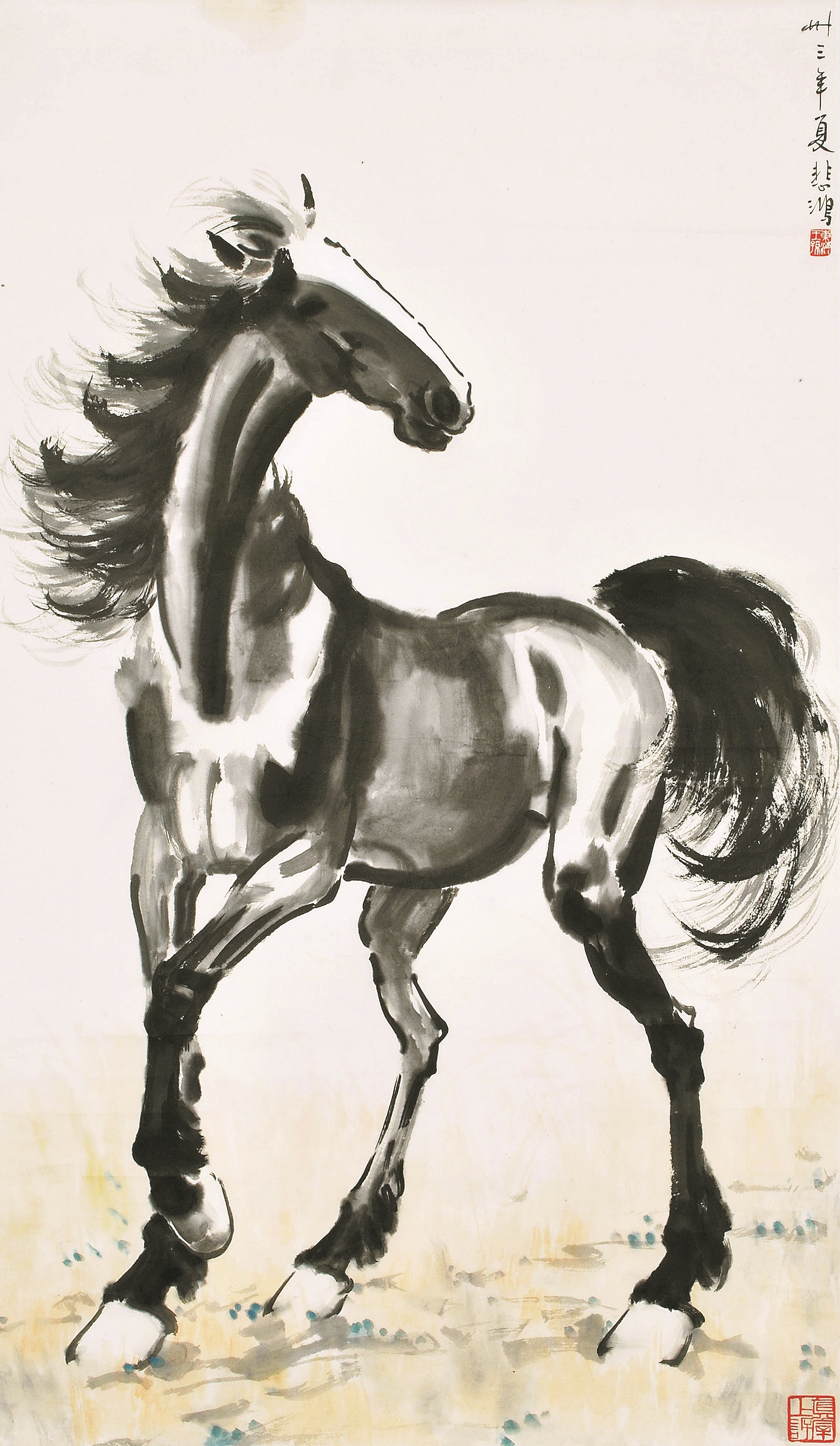 徐悲鸿的马大多画于抗战期间,这幅画即作于1944年的夏天,它象征着中国人民抵抗侵略者的无畏精神。画心右下角有一枚齐白石为他刻的“真宰上诉”,意指徐悲鸿笔墨的酣畅淋漓。从此幅《立马》中,确可印证。