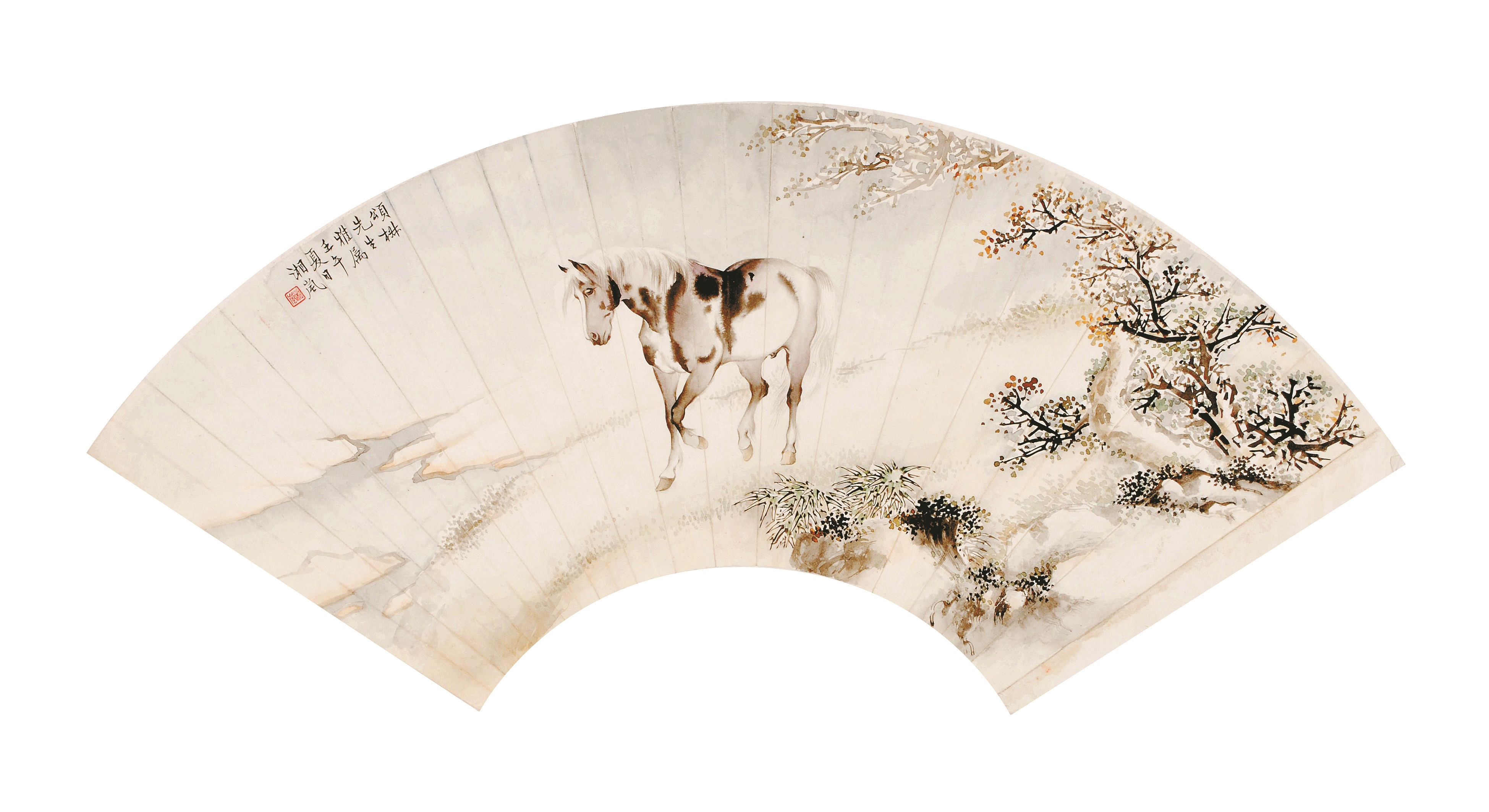 赵叔孺画马,喜欢以寻常之物柳树来营造悠然清雅的氛围,传递“闲适”和“隐逸”的心境,这也是他的马能够雅俗共赏的重要原因。赵叔孺弟子众多,画马真传首推戈湘岚,天一阁所藏的扇面《立马》便是明证。