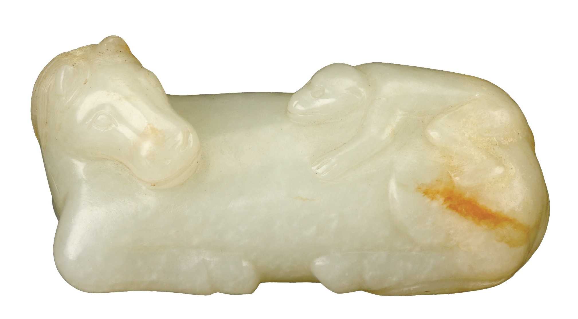 此件白玉圆雕卧马通长7.7厘米,通宽3厘米,通高3.6厘米。质感温润细腻,光泽柔和,局部沁色。马的体态肥厚,神情安逸,四足紧贴腹侧,作竖耳回首状。其眼、鼻、口、毛发均为阴刻,鬃毛分披于颈,长尾藏于身下,刻画细致。马背上驼有一猴,上肢一前一后,下肢屈伏,颇具动态。马、猴形象的组合,寓意“马上封侯”,乃中国传统吉祥纹样。