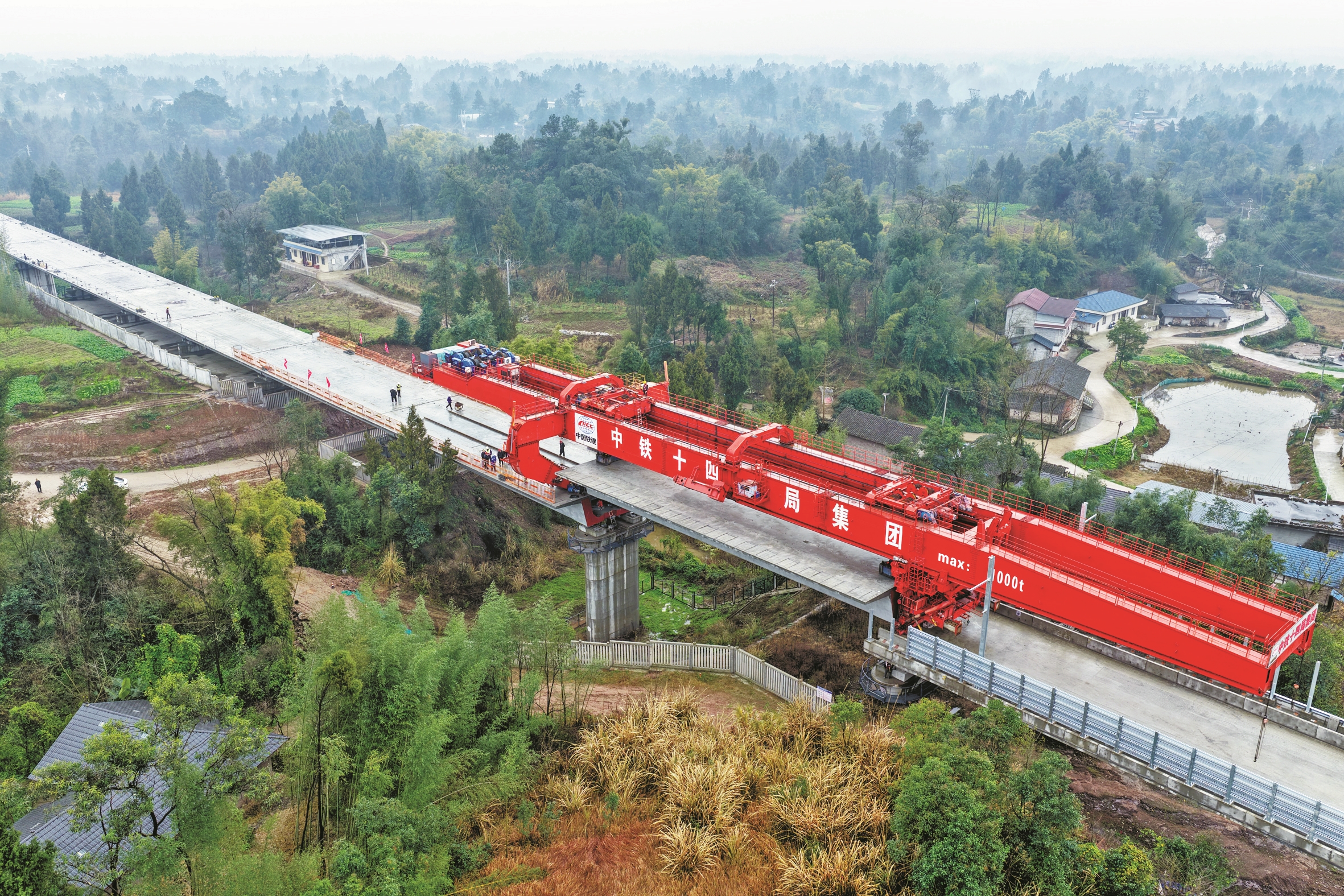 2月9日,随着最后一榀箱梁平稳落位,由中铁十四局承建的成渝中线高铁重庆大足段箱梁架设任务收官,为后续无砟轨道铺设、铺轨施工创造条件。成渝中线高铁是我国“八纵八横”高铁网沿江通道的重要组成部分,正线全长292公里,设计时速350公里。图为当天拍摄的成渝中线高铁重庆大足段第419榀箱梁架设现场(无人机照片)。(新华社记者 陈诚 摄)