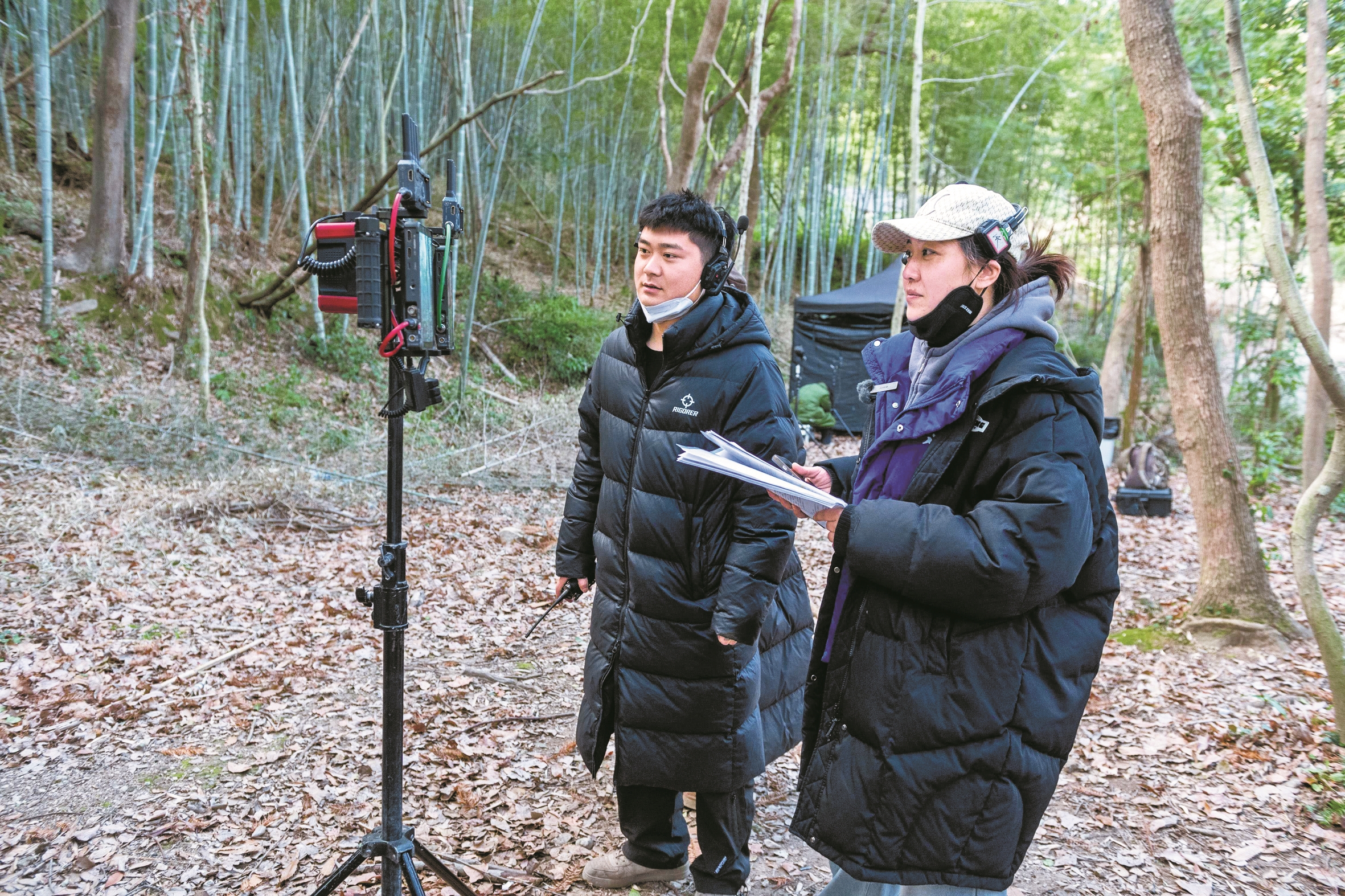 昨天早晨六点半,天色刚亮,象山马岗村后山上的气温接近零摄氏度,但30余人的短剧剧组已在树林里忙得热火朝天:布置灯光、架摄像机、搭建监视帐篷……