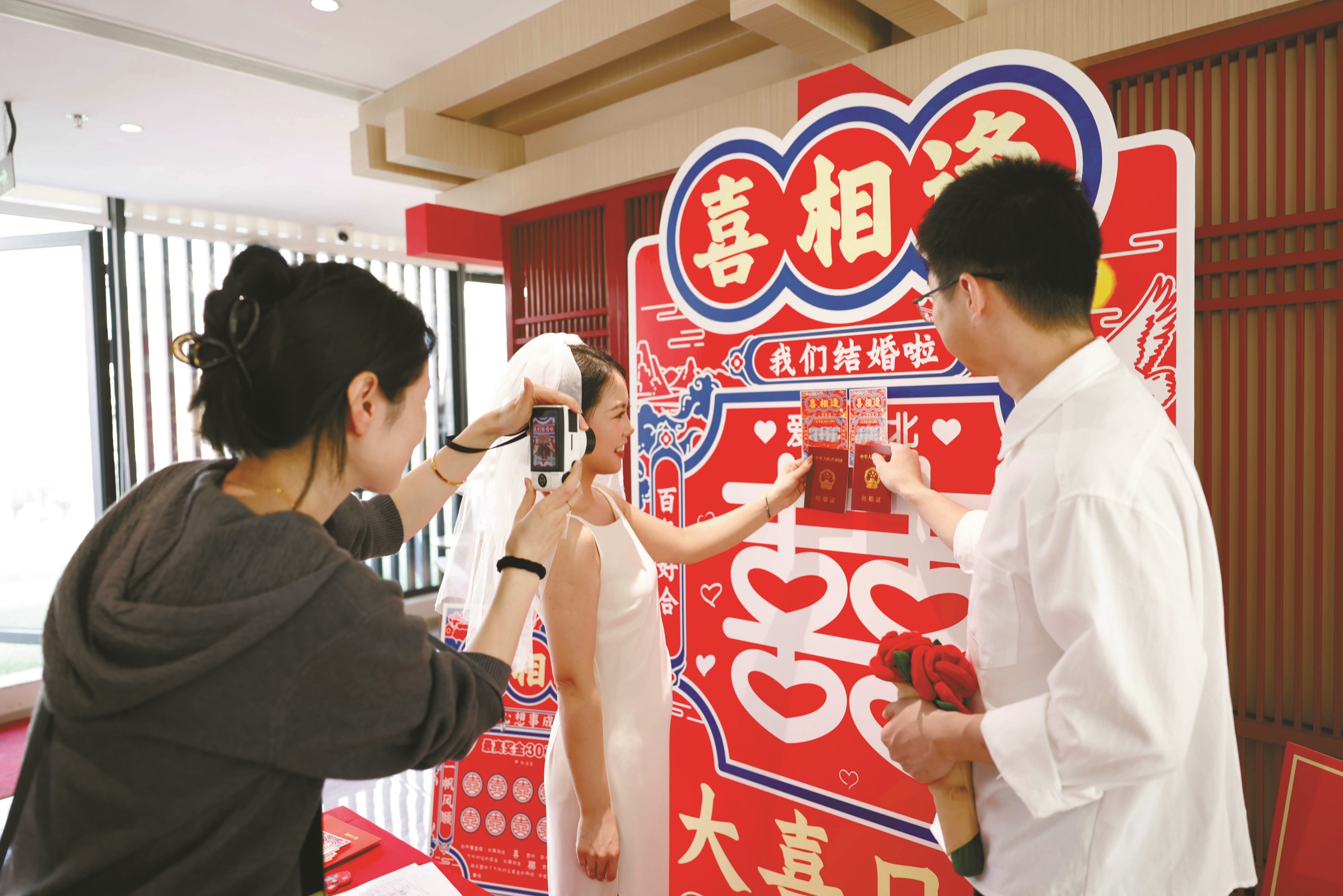 本报讯(记者王佳辉 通讯员李越 丁宇沁)昨日,江北区婚姻登记中心洋溢着温馨浪漫的氛围,超60对新人领取了结婚证。