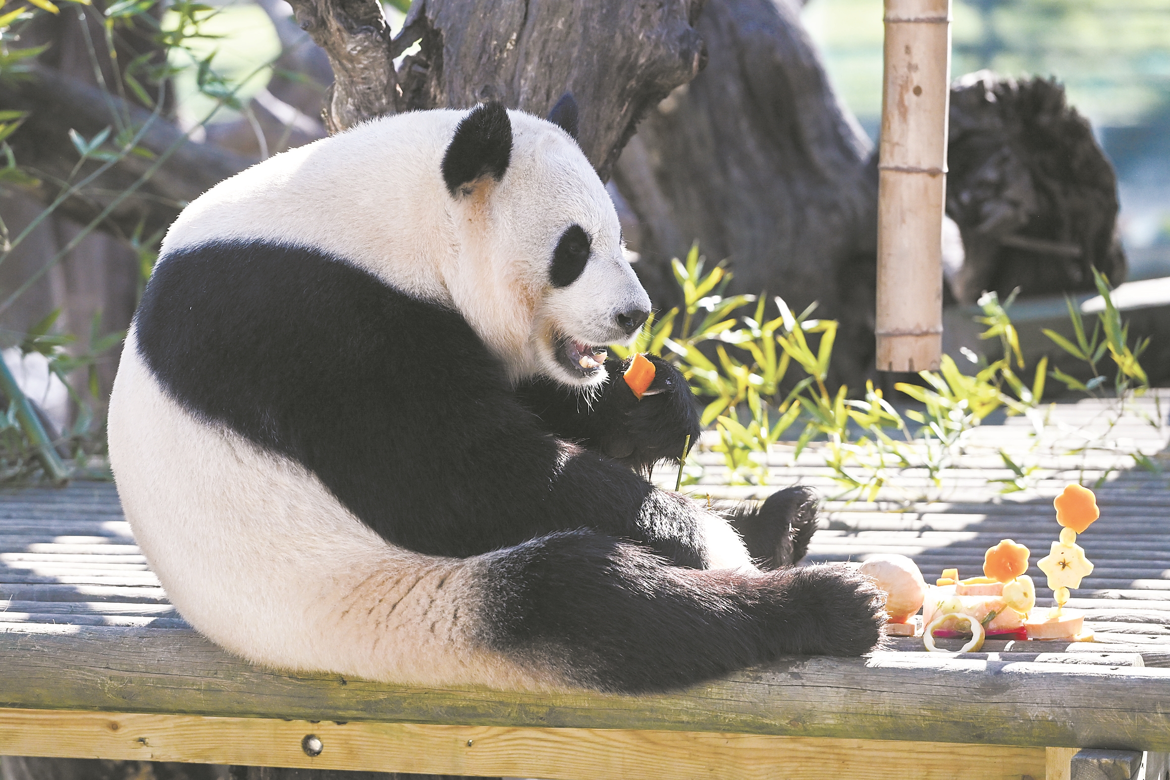 2月14日,大熊猫“茱萸”在西班牙马德里动物园内享用“春节大餐”。
