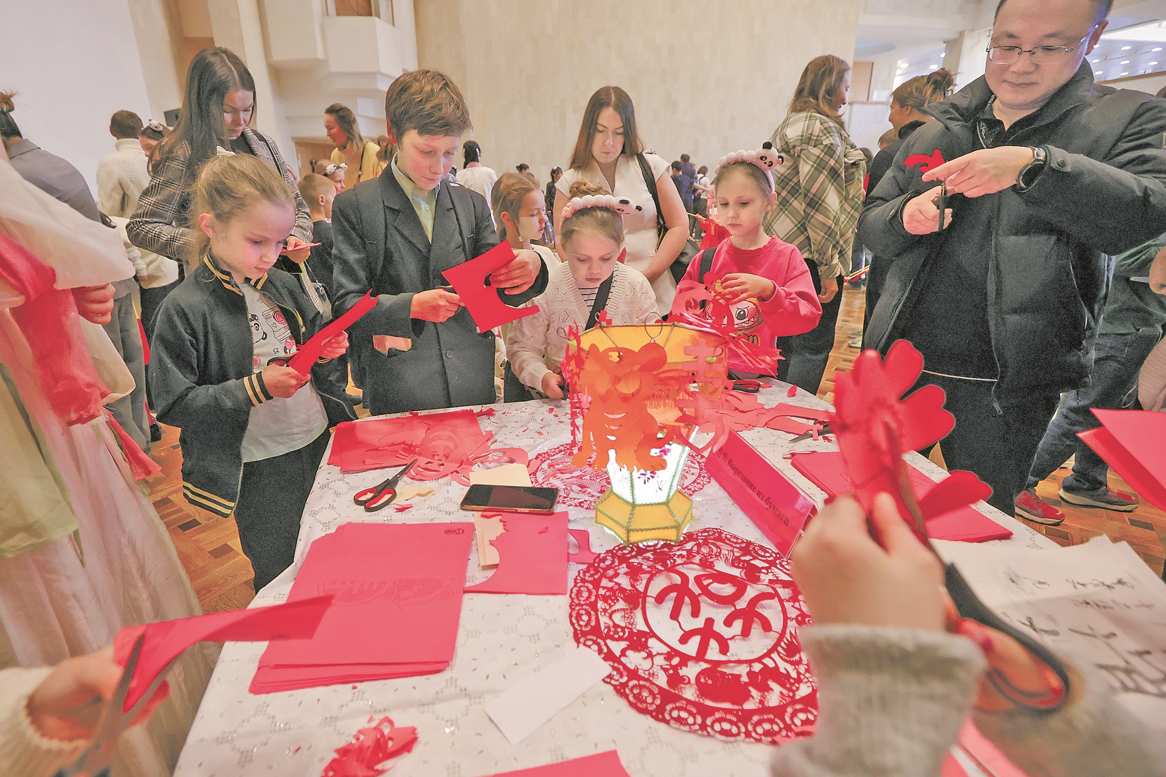 2月14日,在俄罗斯圣彼得堡,当地民众体验中国剪纸。