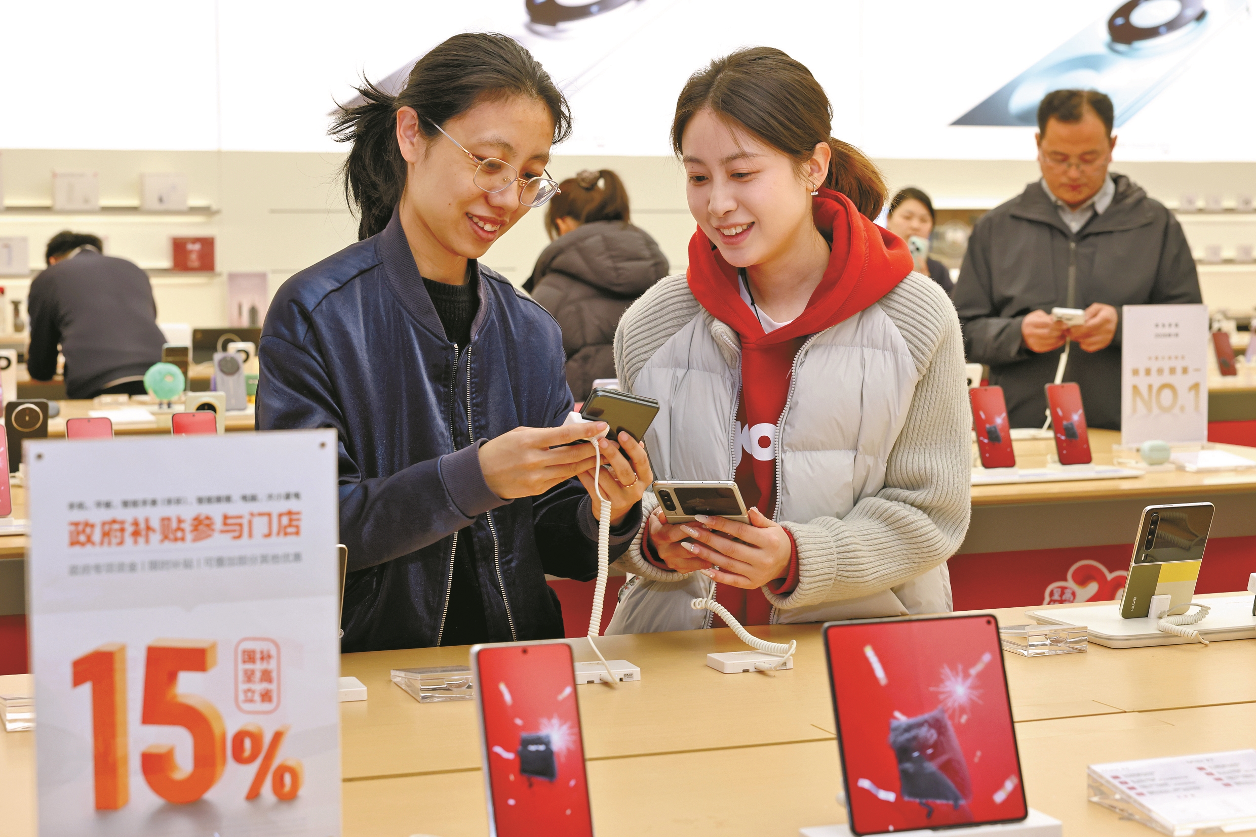2月21日,消费者在山东省枣庄市一家手机专卖店选购手机。