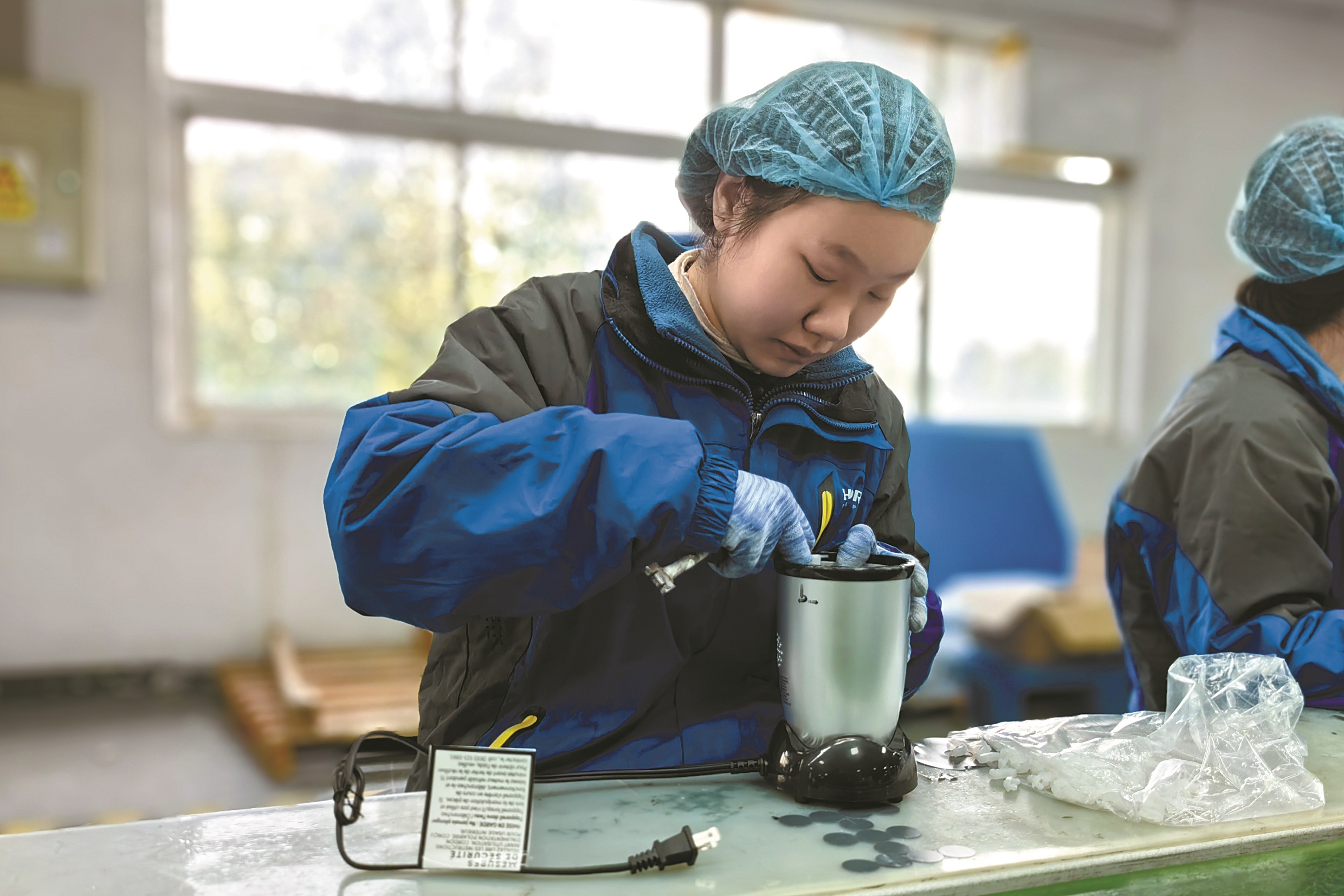 组装、测试、外观检测、包装……生产线上的节奏紧凑而有序。来自四川、贵州、安徽、河南等地的40名员工开足马力,赶制着一批即将远渡重洋的榨汁机。
