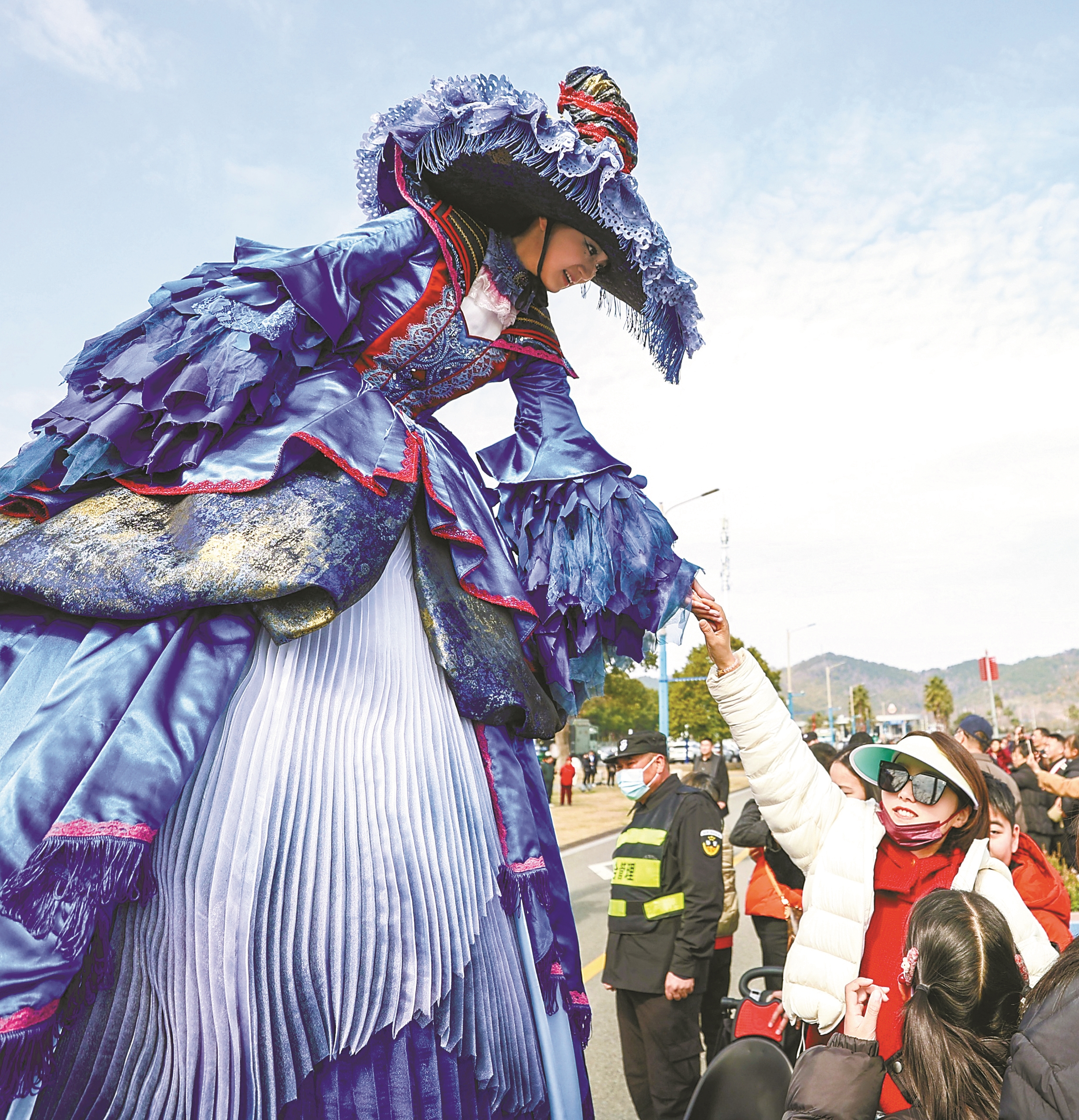 春节假期,浔梦剧团带来高跷木偶剧《白马王子》,演职人员穿行于东钱湖小普陀、南湖岸线等景点,带领游客走进充满惊喜的童话世界。(张江科 李颖 摄)