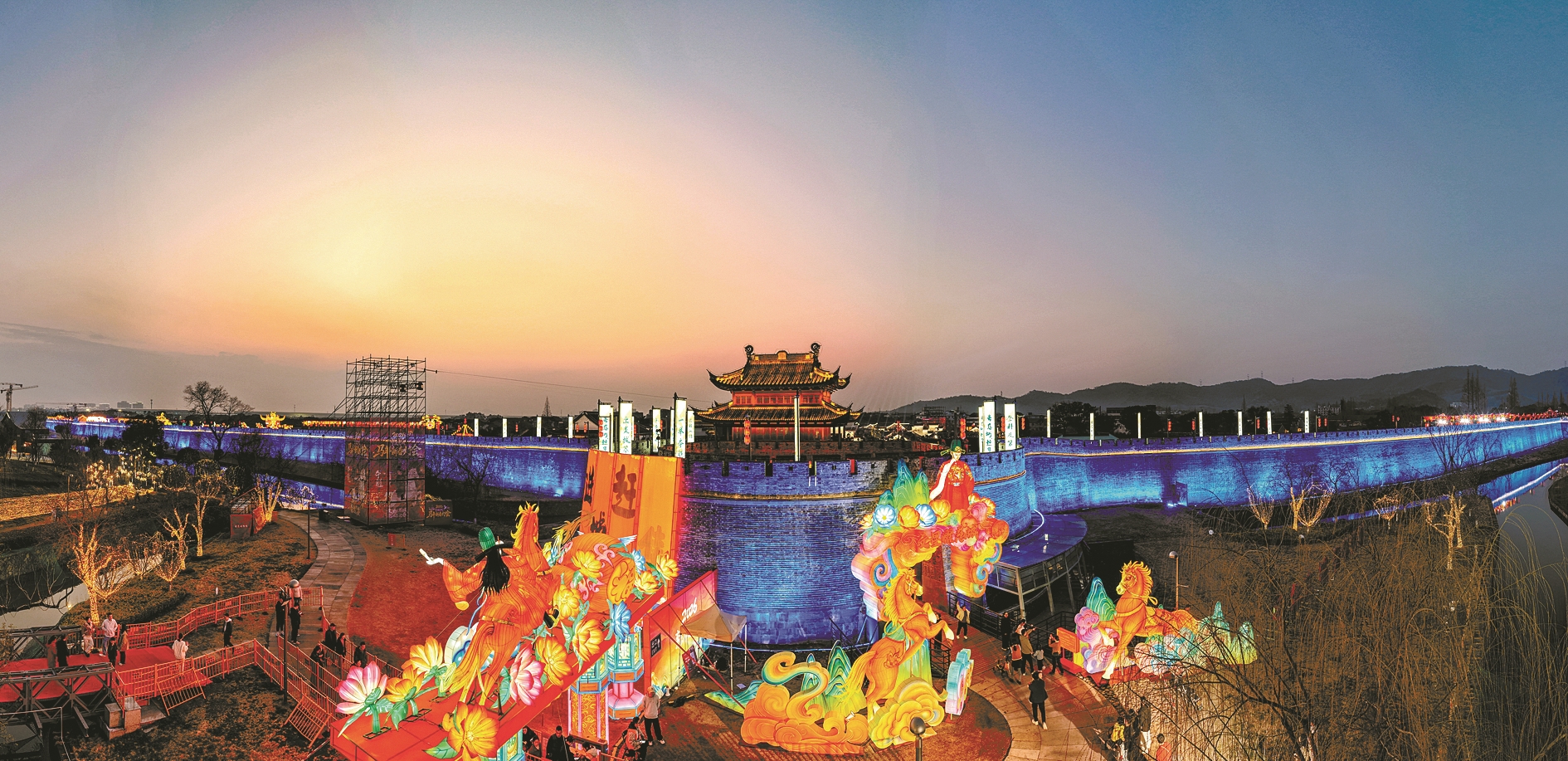 在镇海招宝山,一场名为“山海骑梦”的灯会带领游客闯入《山海经》的奇幻世界。巨大的鳌鱼灯、神兽白泽与流光溢彩的诗墙,让传统神话在夜色中“复活”,古典的浪漫随之而来。老外滩则以巨型祥灯为核心,配合网红打卡墙,走的是时尚打卡与节日祈福相结合的路子。而在慈城古县城,灯会的叙事逻辑则转向了人文与祈福。以“文曲星”为主线的近百组彩灯,点亮了千年古城的街巷,将光影艺术与“马力全开迎新年”的现代祝愿巧妙结合。海曙区同样不遑多让,罗城灯展构建起“一街一园三节点”的都市夜游体系,东渡门的“海丝扬帆”与望京门的“马到成功”灯组,将宁波的港口历史与生肖文化并置,古老的城门在流光溢彩中被重新唤醒,仿佛千年前的商船正载着满舱灯火,驶入今宵的团圆夜色。