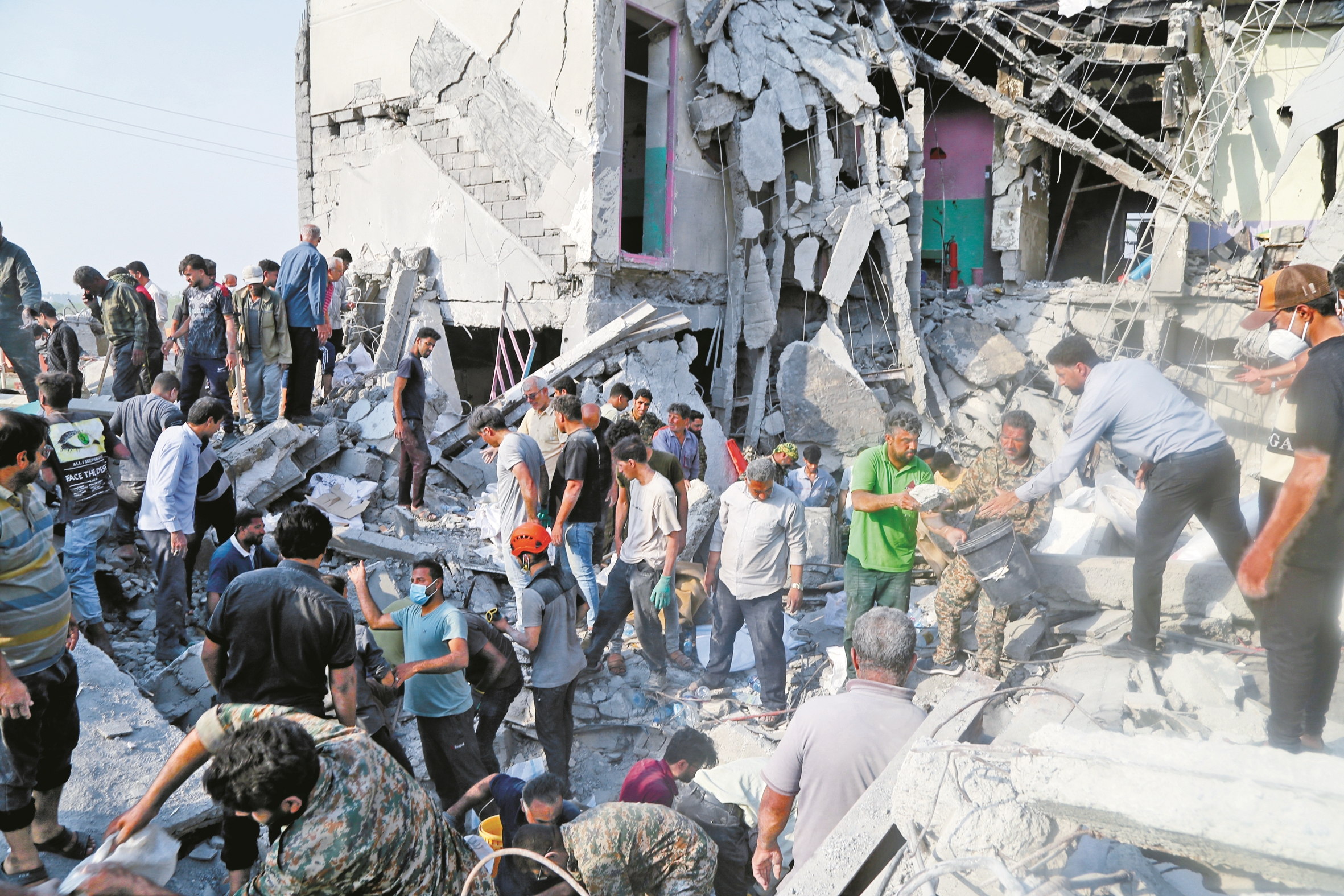 2月28日,在伊朗米纳卜市一所被袭击的小学,救援人员和当地居民试图从废墟里营救伤员。