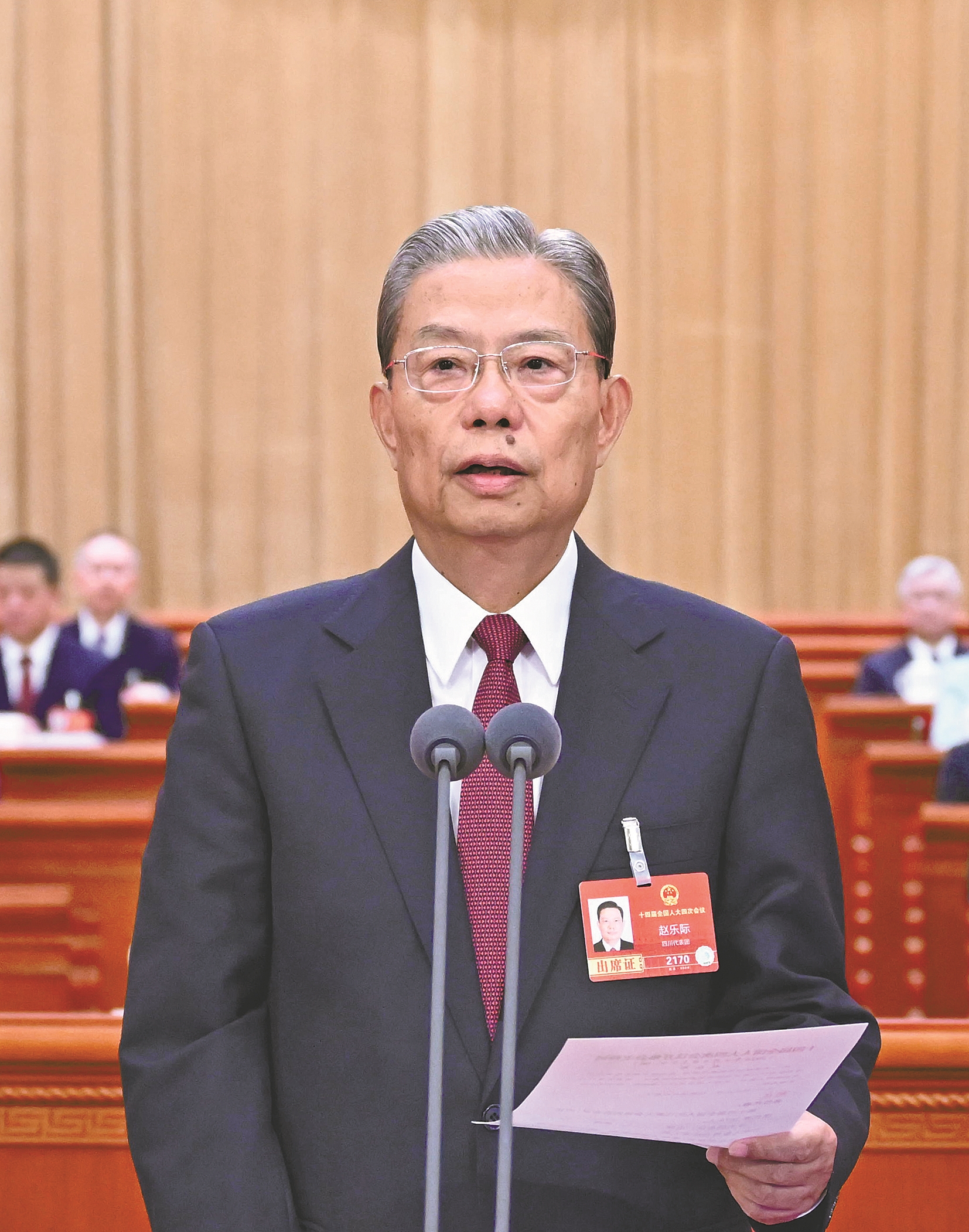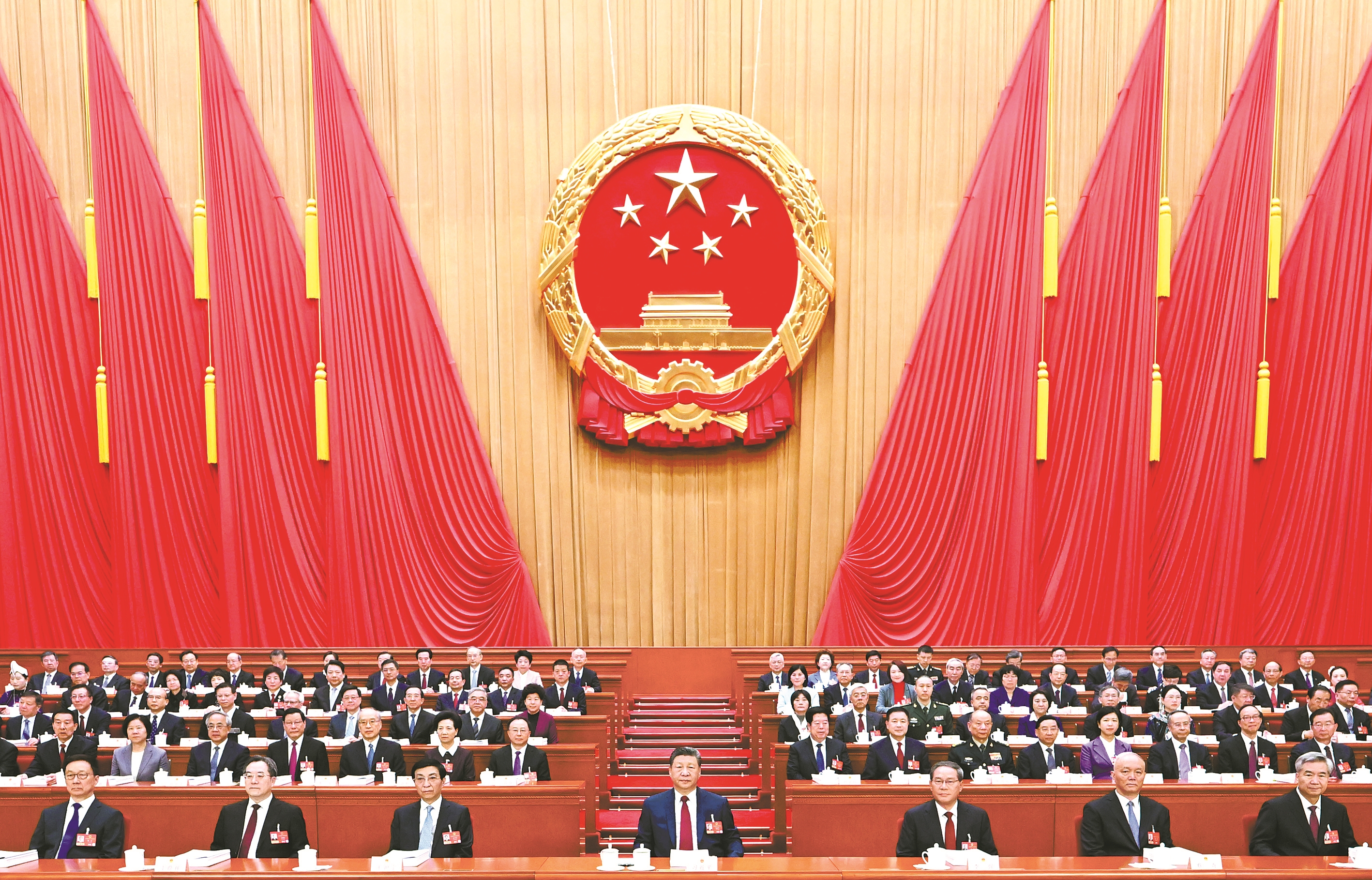 人民大会堂万人大礼堂气氛庄重热烈,主席台帷幕正中的国徽在鲜艳的红旗映衬下熠熠生辉。