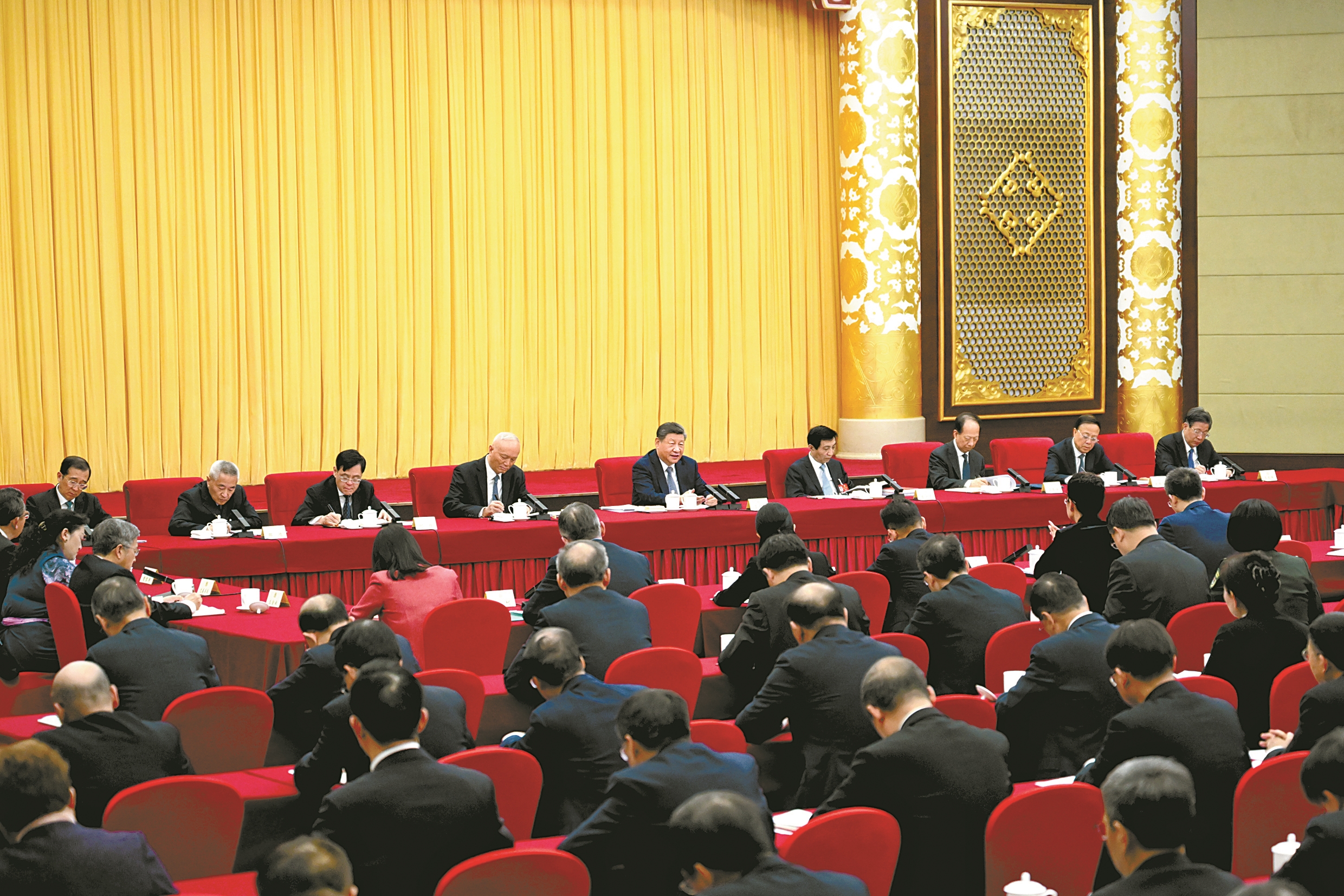 3月6日下午,中共中央总书记、国家主席、中央军委主席习近平看望参加全国政协十四届四次会议的农工党、九三学社、医药卫生界、社会福利和社会保障界委员,并参加联组会,听取意见和建议。中共中央政治局常委、全国政协主席王沪宁,中共中央政治局常委、中央办公厅主任蔡奇参加看望和讨论。 (新华社记者 谢环驰 摄)