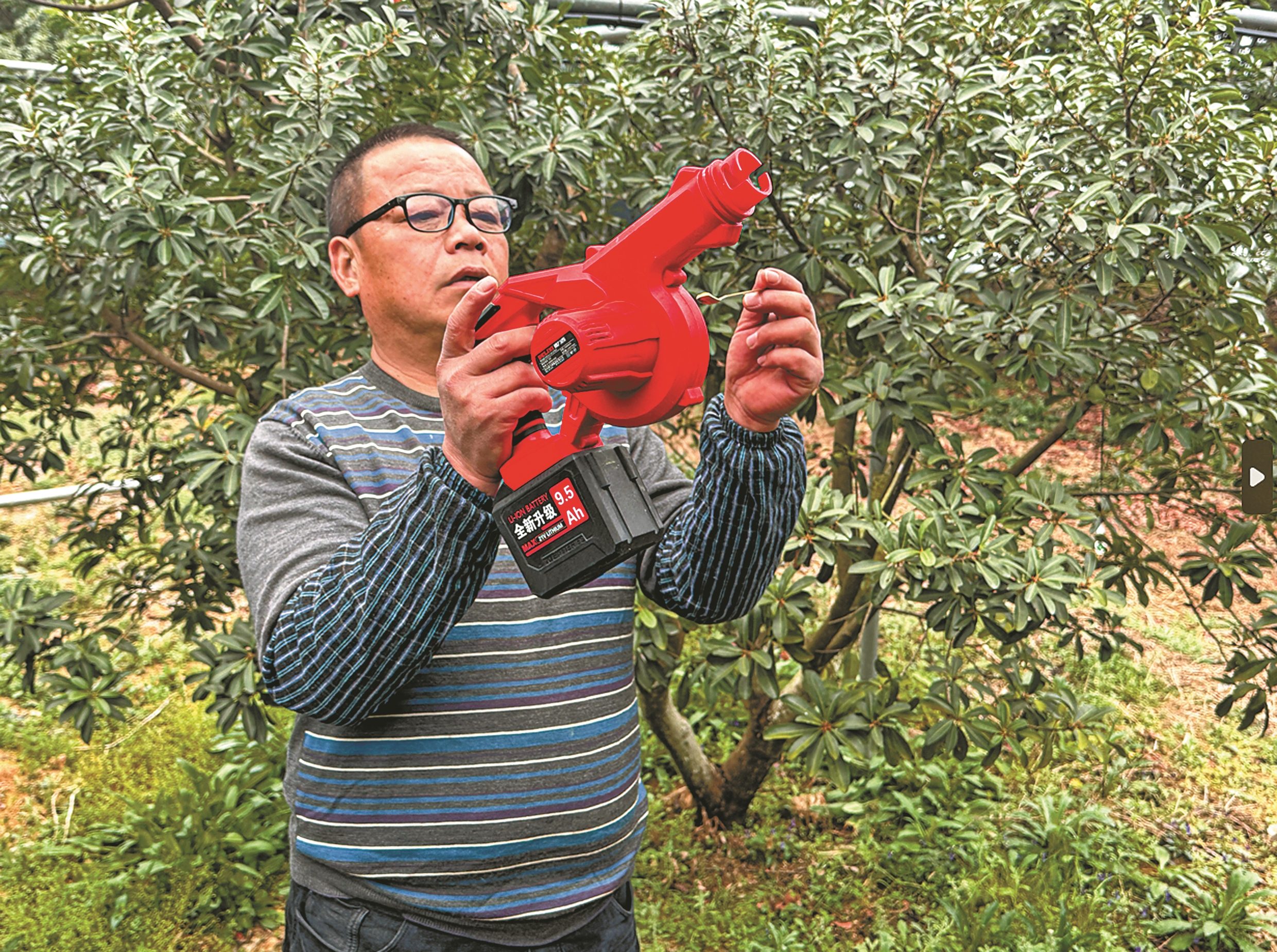 慈溪杨梅种植大户岑启校手持鼓风机,在大棚中进行人工授粉作业。(蒋亚军 何晴 摄)