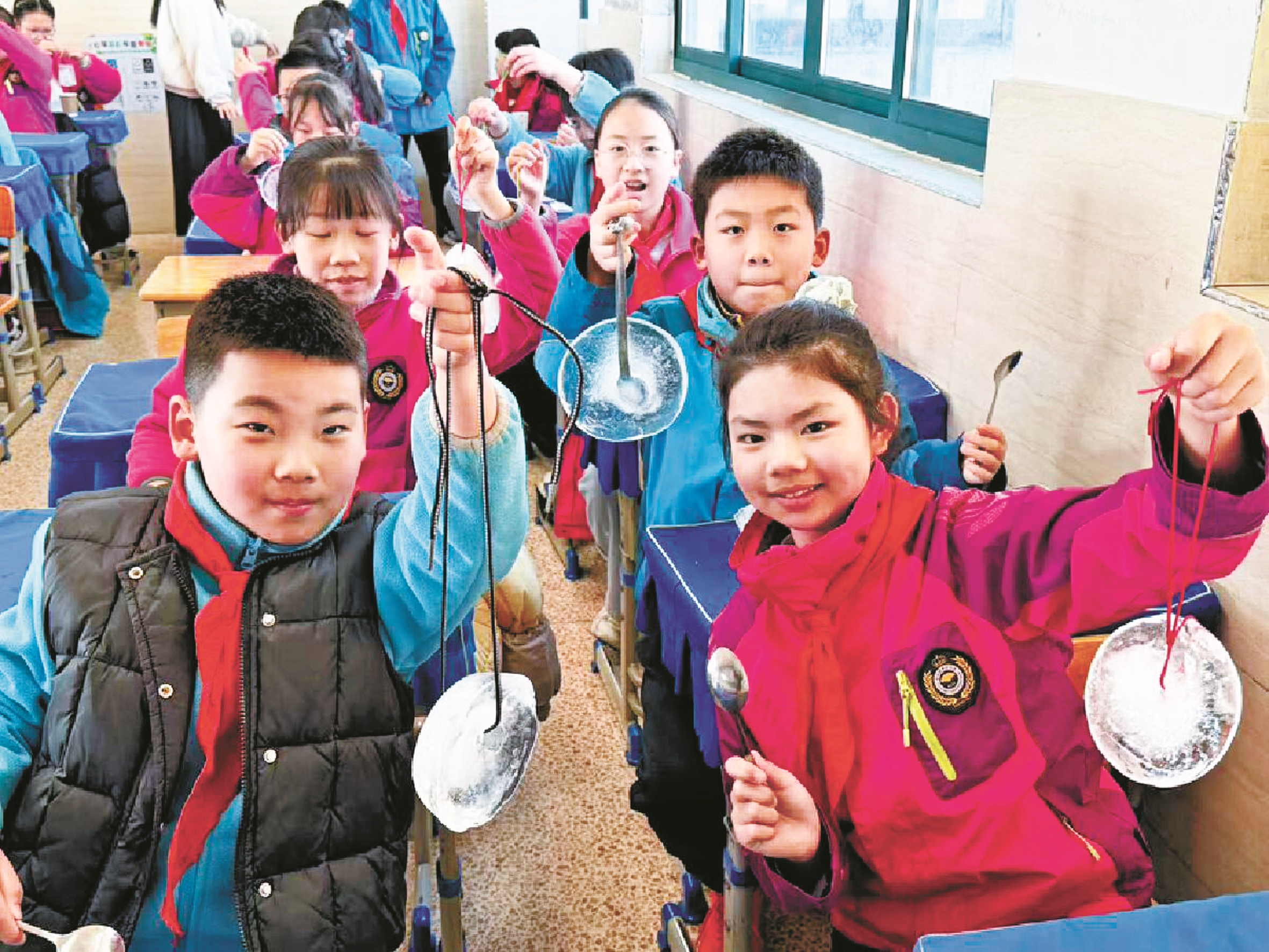 《稚子弄冰》是部编版五年级下册的经典古诗,诗中勾勒出孩童玩冰的鲜活画面。该班的语文老师周金晶说,班上学生多为南方孩子,平日里鲜有见冰、玩冰的机会,难以直观理解诗中“做银钲”“穿彩丝”“敲银钲”等细节,也难以体会古时孩童的玩冰乐趣。