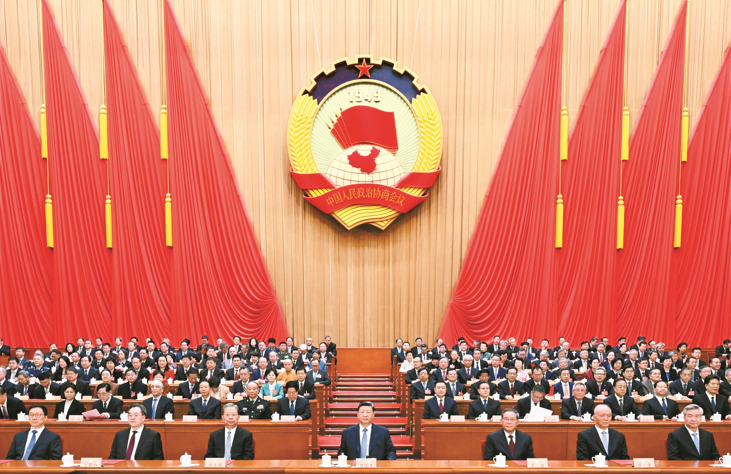 3月11日上午,中国人民政治协商会议第十四届全国委员会第四次会议在北京人民大会堂闭幕。这是习近平、李强、赵乐际、蔡奇、丁薛祥、李希、韩正在主席台就座。 (新华社记者 燕雁 摄)