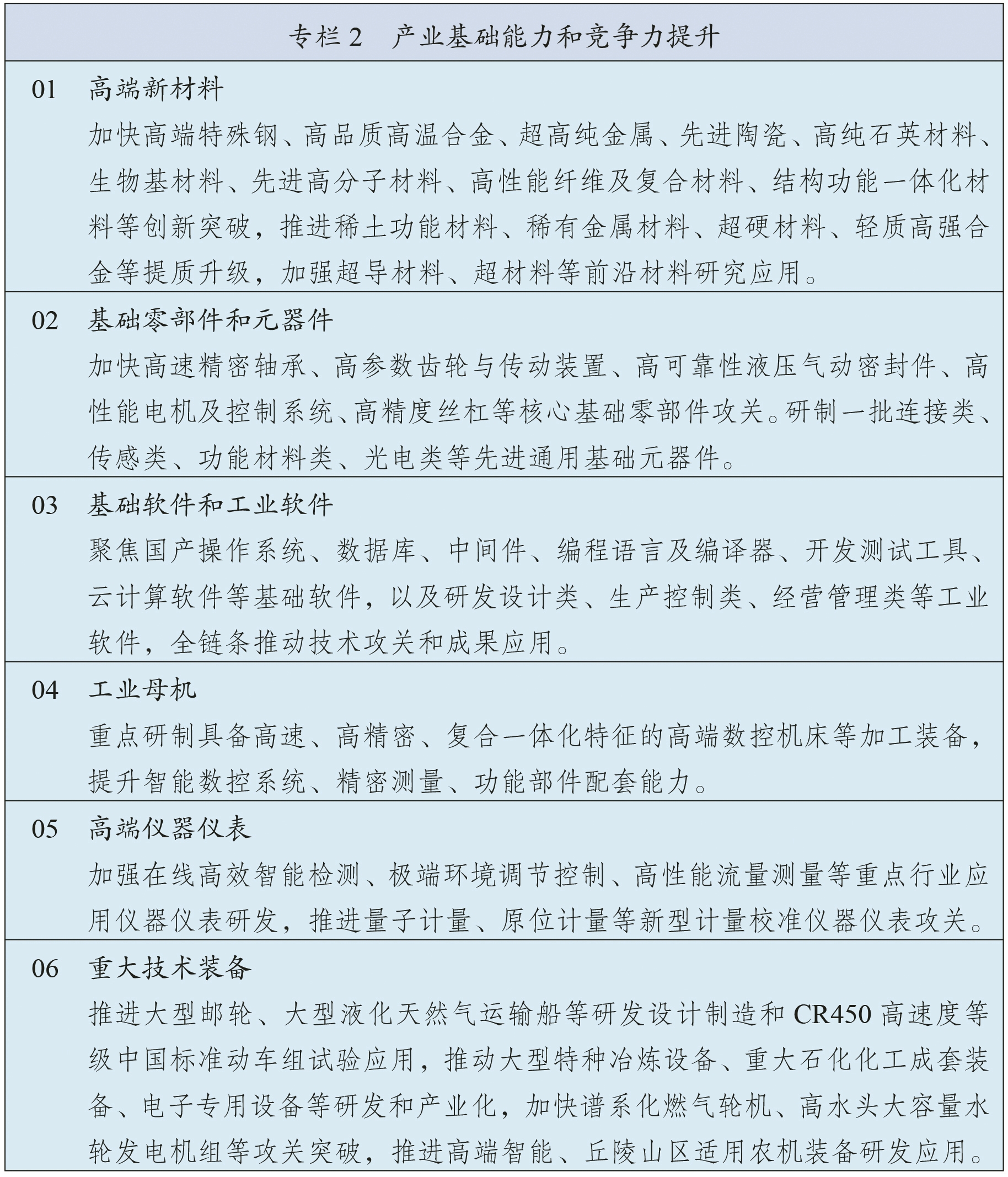 实施产业基础再造工程,加快突破一批重大基础技术、工艺和产品,推进先进材料、跨尺度制造等创新应用。实施重大技术装备攻关工程,突破一批标志性重大技术装备。滚动实施制造业重点产业链高质量发展行动,建立健全产业链供应链安全风险评估和应对机制,持续增强稀土、稀有金属、超硬材料等竞争优势,加强重要战略性矿产高质高效综合利用。推进国家战略腹地建设和关键产业备份,建设战略性产业基地、物资储备基地和基础设施。建立产业基础竞争力调查制度,强化共性技术研发支撑能力。完善首台(套)、首批次、首版次应用政策。