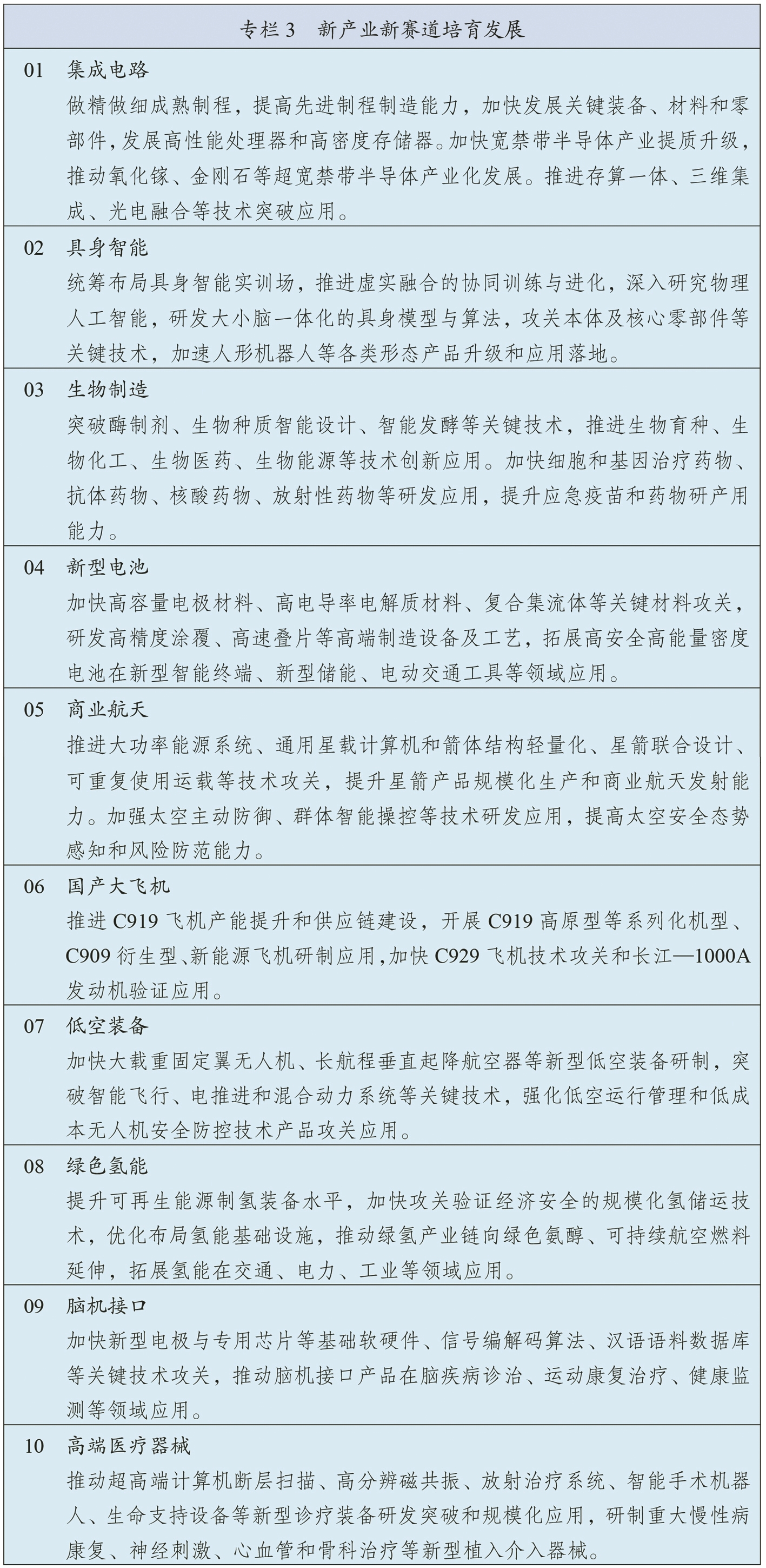 瞄准引领未来发展重点领域,构建未来产业全链条培育体系,推动量子科技、生物制造、氢能和核聚变能、脑机接口、具身智能、第六代移动通信等成为新的经济增长点。加强未来产业识别和动态调整,强化基础性、前沿性、颠覆性技术布局。建立未来产业投入增长和风险分担机制,组织实施未来产业发展示范工程,探索多元技术路线、典型应用场景、可行商业模式、市场监管规则。布局一批国家未来产业研究院和概念验证中心,依托科教资源优势突出、产业基础雄厚地区建设一批未来产业先导区。