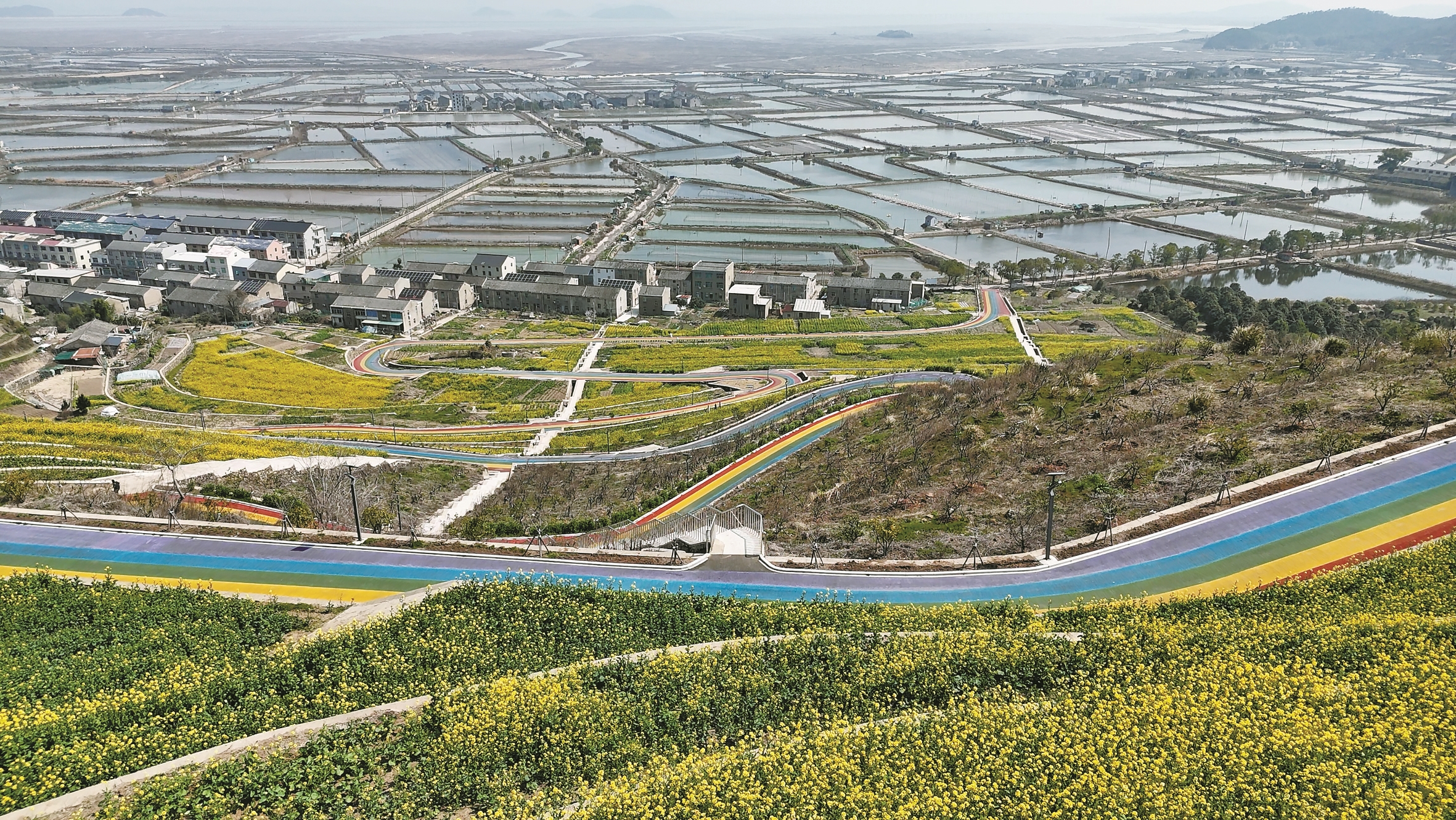 近日,在宁海越溪乡南庄村,千亩油菜花田开放。沿着崭新的彩虹步道,游客欣赏完花海,便驾车驶向附近的共富工坊,选购刚从滩涂上挖起的新鲜蛏子。