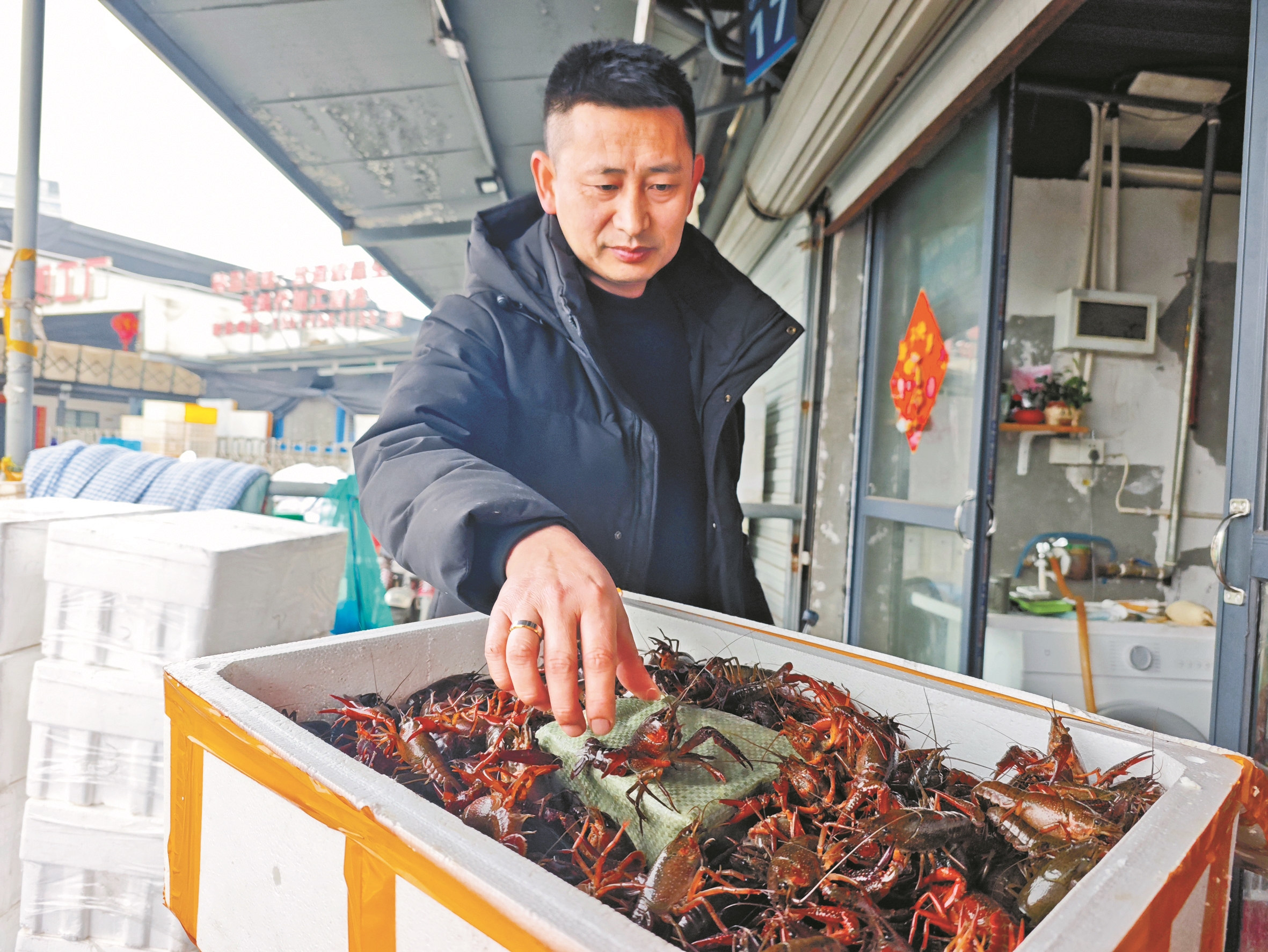 “主要来自湖北潜江,那边是老产区,肉质好。”黄德超一边说,一边随手从筐里抓起一只小龙虾给记者看,“像这种青壳、肚子白、小钳子的,捏着有弹性的,肉就饱满。”