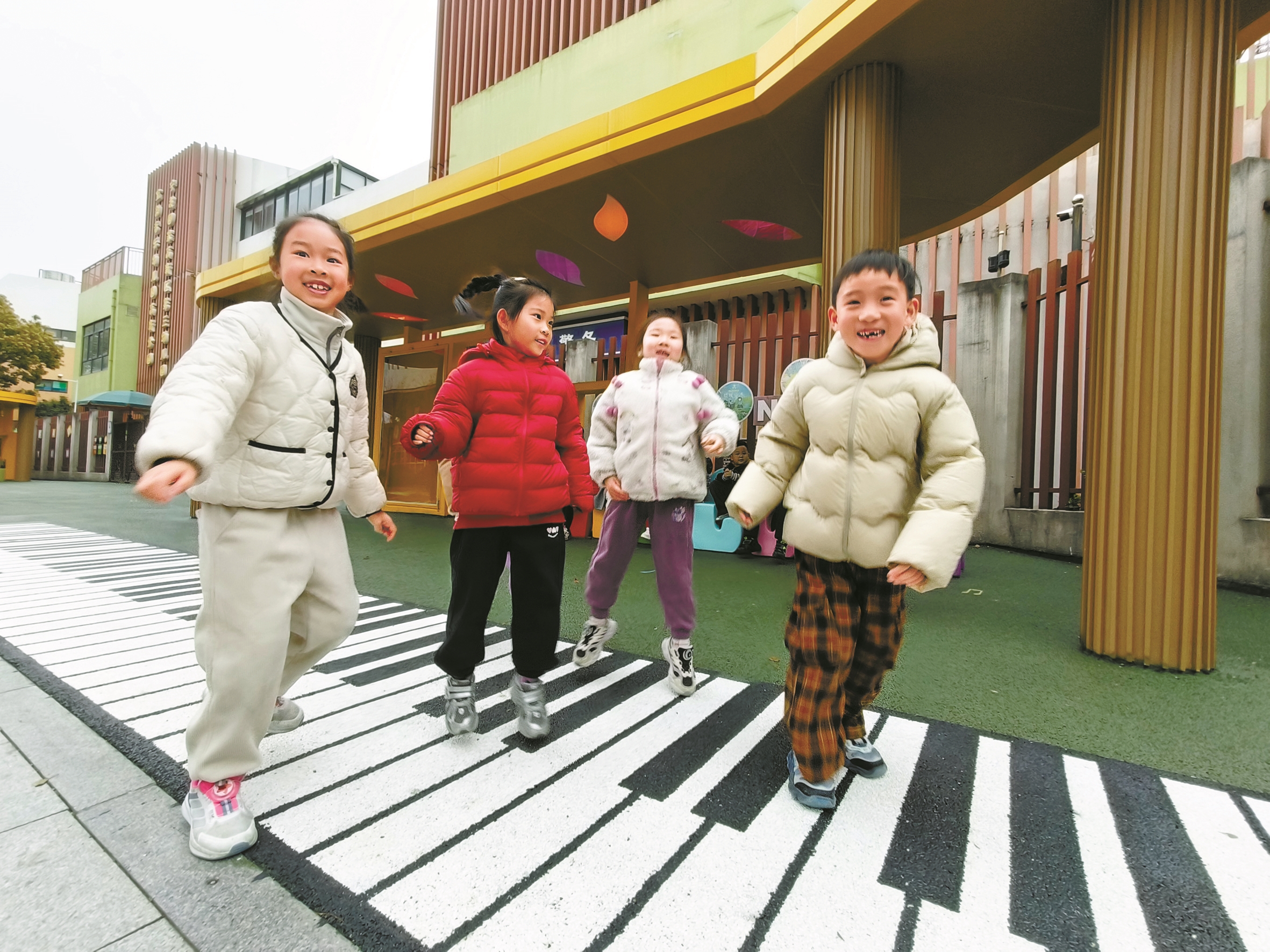 昨日,宁波国家高新区第三幼儿园“最美上学路”正式启用。黑白琴键造型的斑马线、绘着五线谱与乐器图案的连廊立柱,让这条通道变身流动的美育课堂。