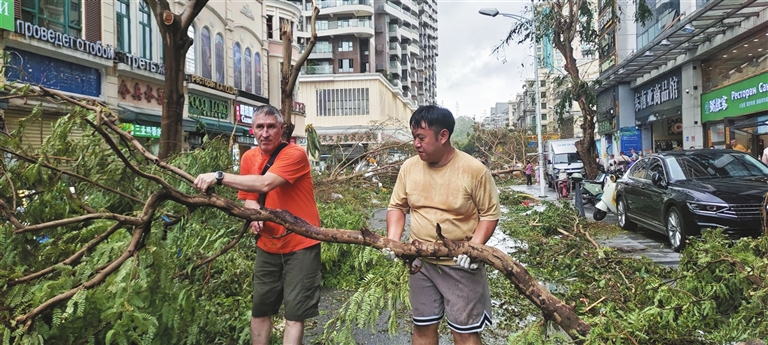8月25日,台风“剑鱼”过后的吉阳区海韵路,断枝残叶与各类杂物横亘路面,往日通畅的道路成了“障碍场”。正当吉阳区旅游和文化广电体育局干部与大东海社区工作人员埋头开展清障工作时,一位“洋面孔”的主动加入,为这场忙碌的灾后恢复重建增添了跨越国界的温情——来自俄罗斯的友人安德烈(化名),用双手传递出风雨后的暖心力量。