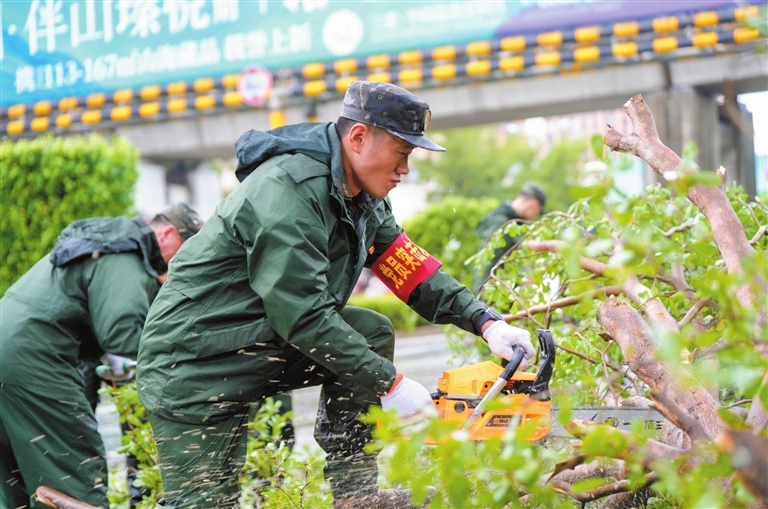 “我们早一刻投入战斗,人民群众就多一分方便。”到达荔枝沟路后,官兵迅速分组投入战斗,他们有的用油锯将倒伏的树木切成小段后进行转移,有的用铁铲将堆积的枝叶和垃圾铲走,有的爬到树上对树枝进行修剪。台风过后,大雨不断,空气异常湿热,官兵的衣服很快就湿透了,但大家并没有慢下来,一直战斗到中午,终于将道路抢通。