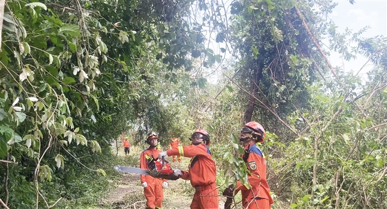 8月26日的三亚凤凰岭,台风“剑鱼”留下的痕迹仍触目惊心——通往三亚广播电视发射塔的盘山公路上,碗口粗的树木拦腰折断,碎石泥土堆积成小山一样,原本畅通的道路被堵得严严实实。市旅文局迅速联合吉阳区政府、亚龙湾消防救援站、中建一局、三亚传媒影视集团等相关单位,加快灾后抢修,确保信号畅通,一场多方协同的“清障保通战”就此启动。